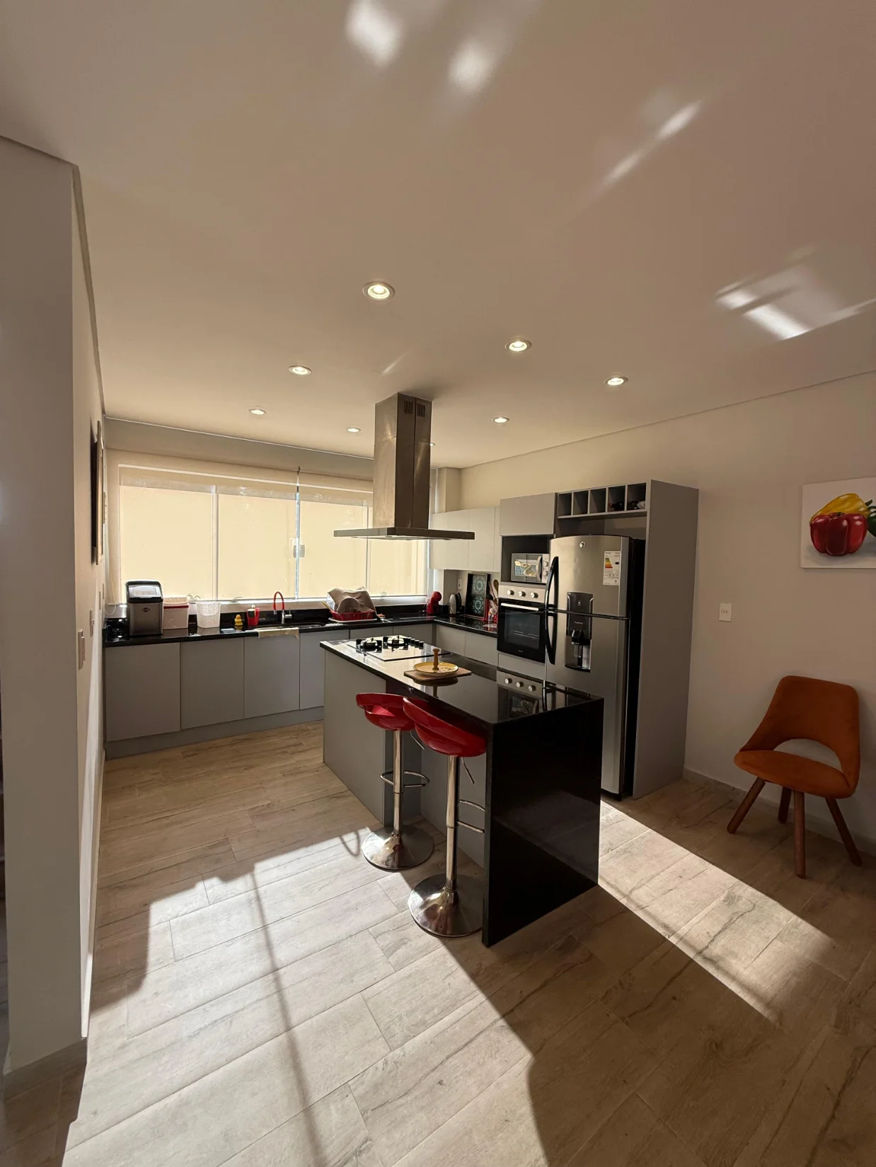 • Cocina equipada con heladera, horno empotrable, anafe (2 hornallas a inducción y 2 a gas), microondas y extractor