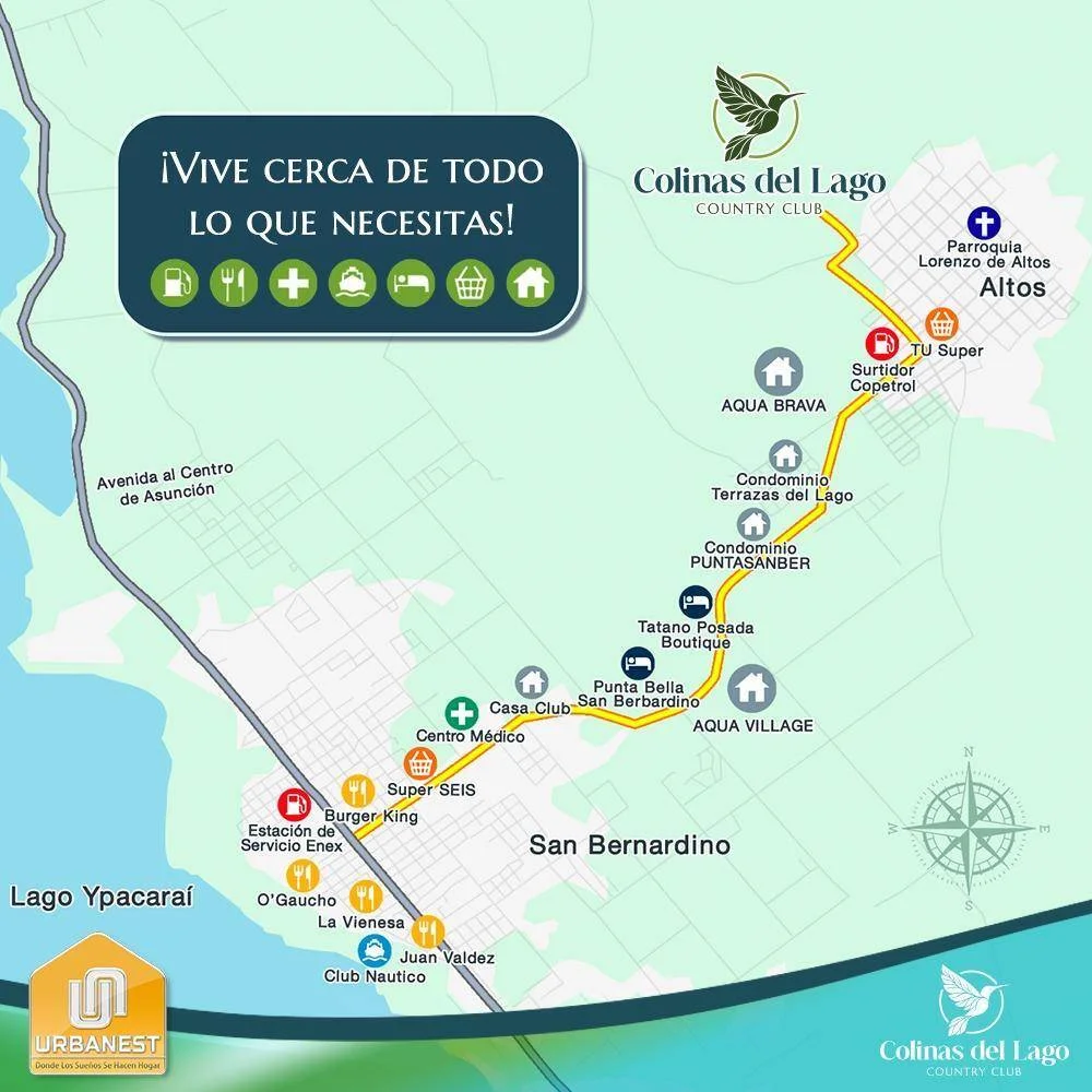 Colinas del lago se encuentra en las cerranias del lago Ypacarai, en el municipio de Altos. El condominio contará con avenida principal pavimentada, red de agua potable, servicio de energía eléctrica y red de aguas servidas.