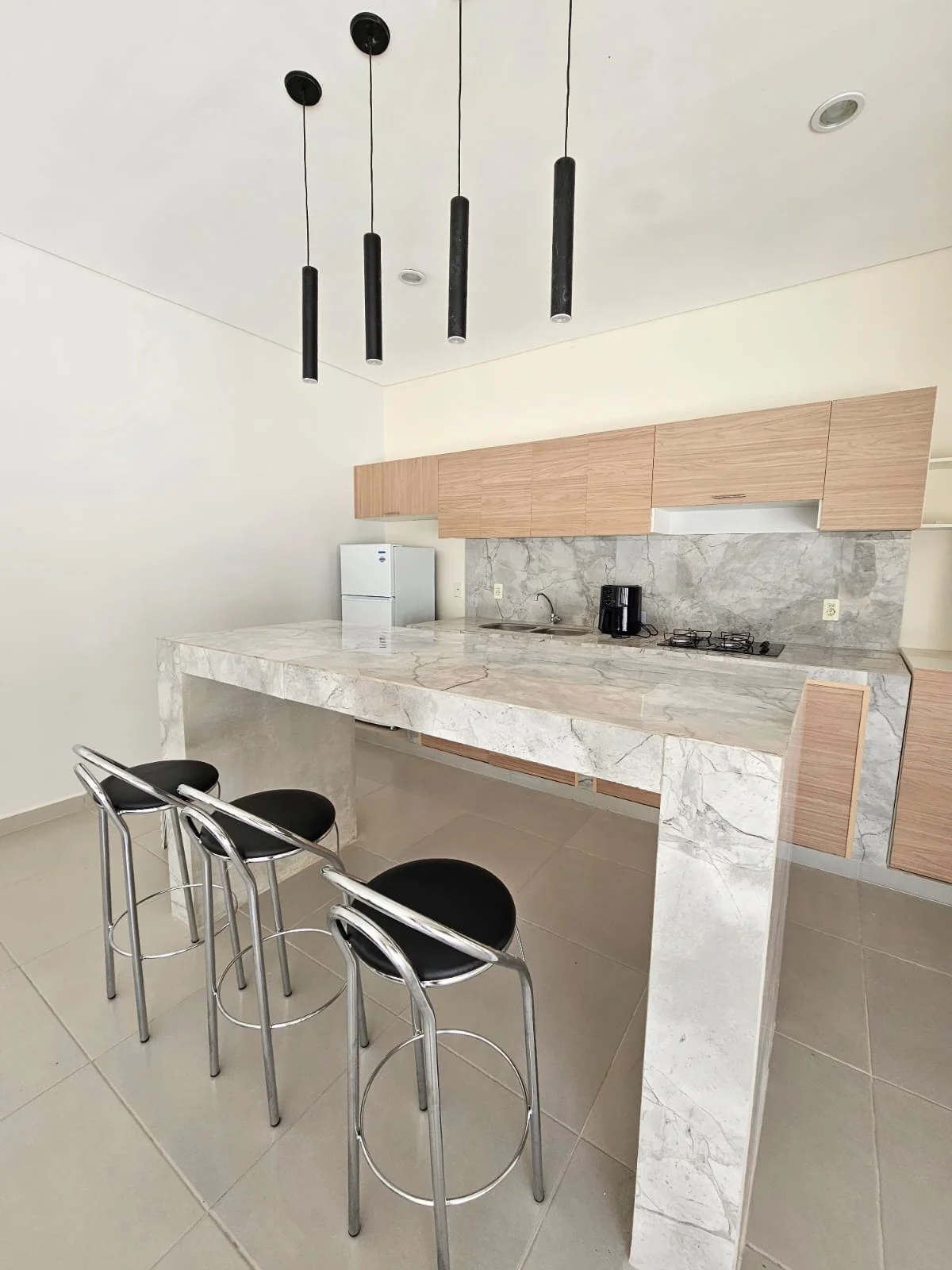 Cocina amoblada, desayunador, amplios ventanales de vidrio, jardín interno.