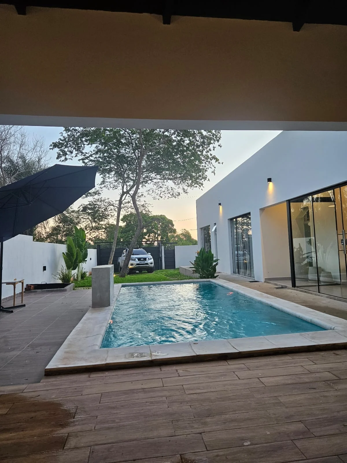 Piscina amplia, con solárium, con cascada y luces