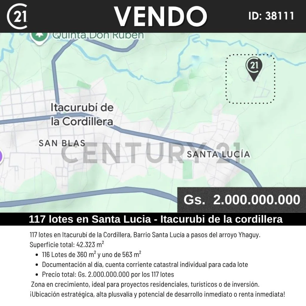 Oportunidad única para inversionistas y desarrolladores inmobiliarios!! 117 lotes en el mismo fraccionamiento en Itacurubi de la Cordillera – 42.323 M² Excepcional oferta compuesta por 117 lotes individuales en uno de los puntos más prometedores del interior del país: Itacurubí de la Cordillera, específicamente en el Barrio Santa Lucía, a tan solo 90 km de Asunción y a pasos del cristalino arroyo Yhaguy, uno de los mayores atractivos naturales de la región. Detalles de la propiedad: • 116 lotes de 360 m² • 1 lote de 563 m² • Superficie total: 42.323 m² • Documentación al día – Listos para transferir • Cada lote cuenta con Cuenta Corriente Catastral individual • Loteamiento con aprobación municipal vigente • Se venden los 117 lotes juntos • Precio: Gs. ***por los 117 lotes Una propuesta de inversión de alta rentabilidad, en un terreno con alto potencial de plusvalía. ¡Se venden todos los 117 lotes en bloque
