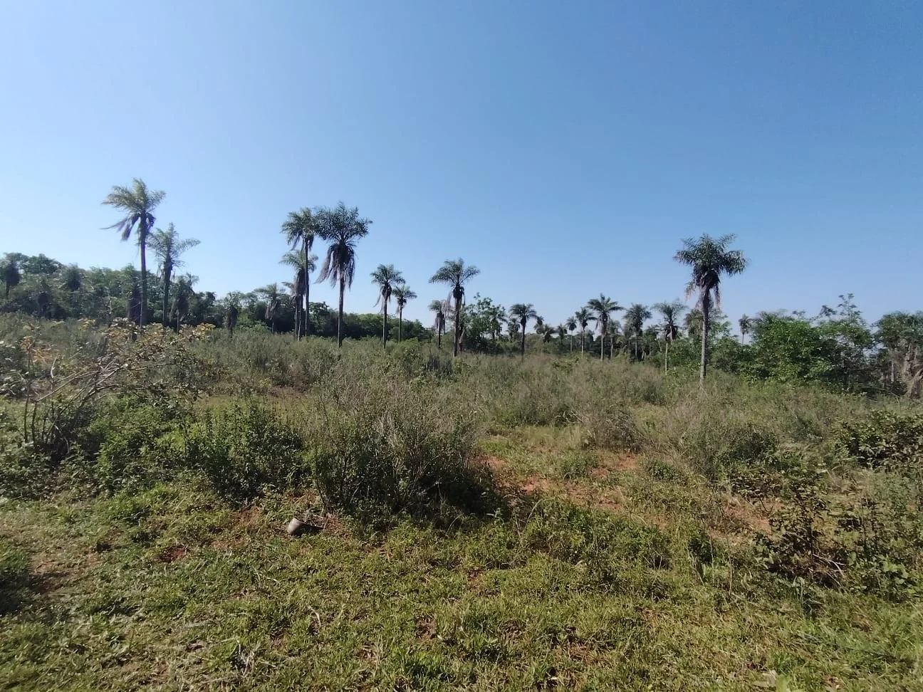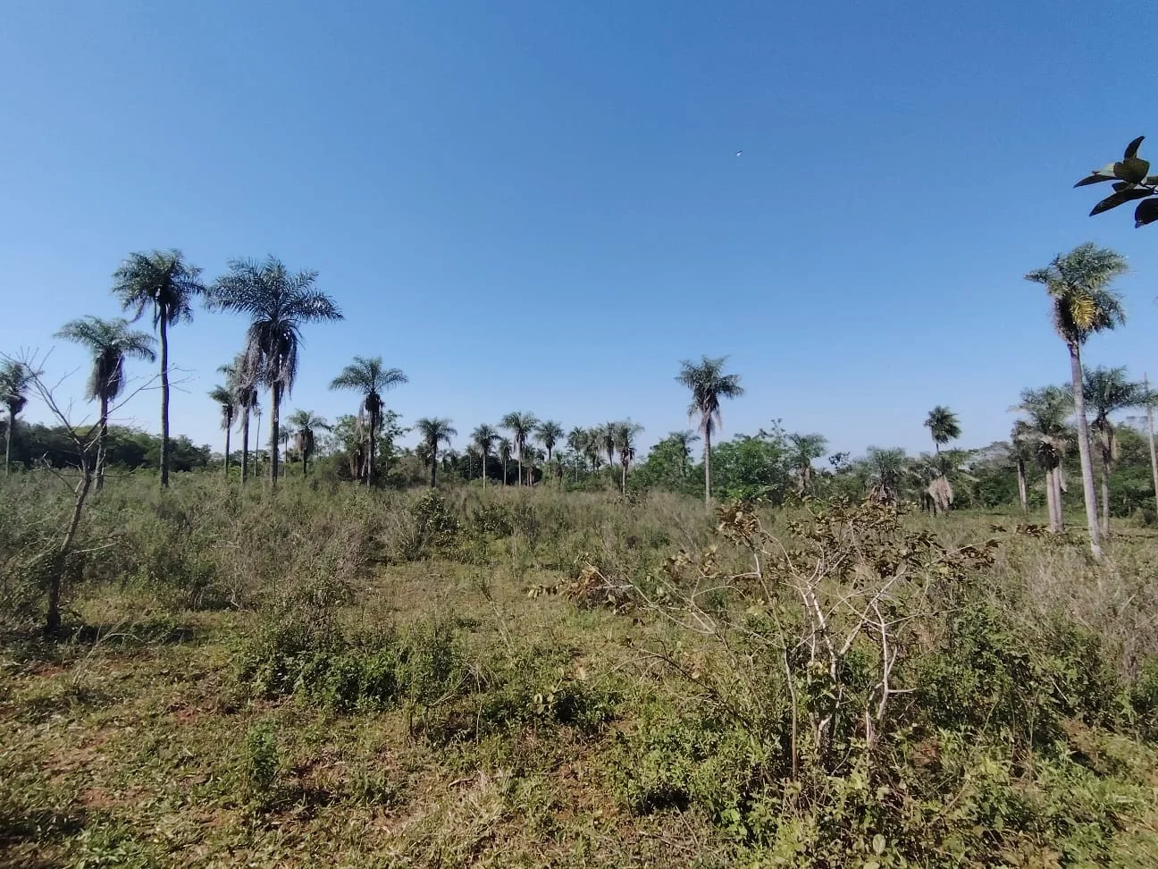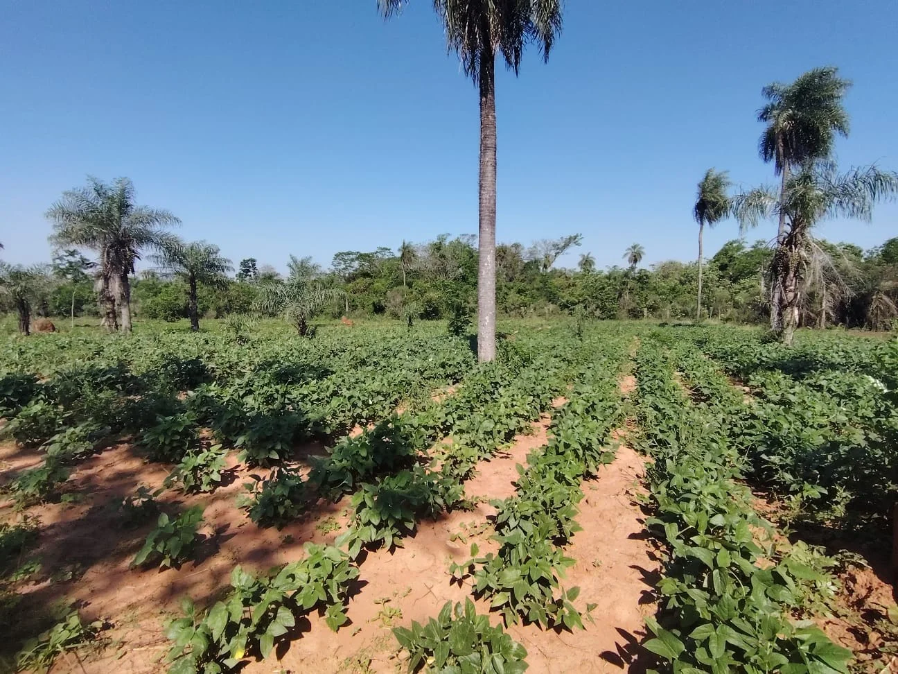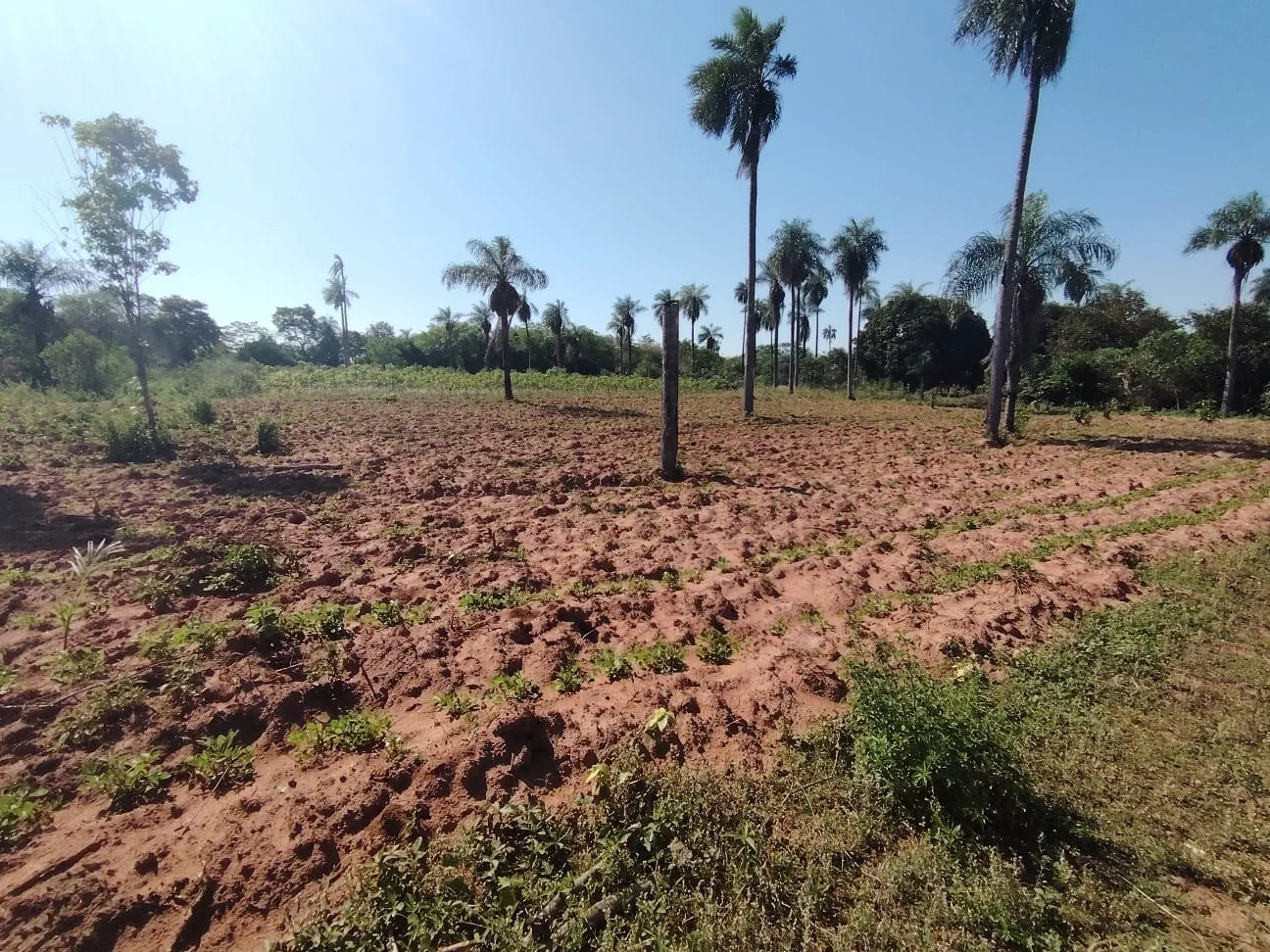 El terreno completamente plano cuenta con algunas plantaciones como mandioca, poroto y algunos frutales.