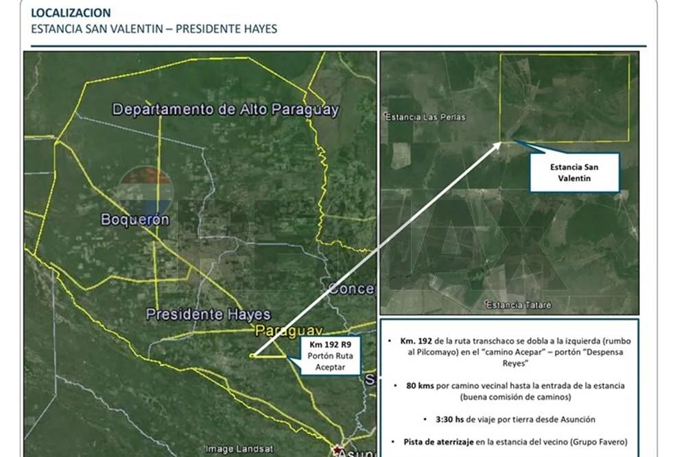 EN VENTA ESTANCIA SAN VALENTÍN | PRESIDENTE HAYES 2.812 ha, 3.350 m² productivos con infraestructura completa Ubicada en la zona de Esteban Martínez, a 90 km del empalme del Km 192 de la Ruta Transchaco. Acceso por Camino Acepar (80 km de camino vecinal en buen estado). Aproximadamente 3,5 horas desde Asunción. Datos principales Superficie: 2.812 ha, 3.350 m² Precio: USD *** Composición del campo 1.700 ha de monte palmar y campo natural con pasturas nativas (estrella, clavel, entre otras) 600 ha de pasturas implantadas (Callide, Bambatsi, Humidícola, Tangola, Gatton, Tanzania) 530 ha de monte con permiso de desmonte vigente (SEAM), apto para aprovechamiento forestal Infraestructura Casa patronal y vivienda para personal Retiro en el sector noreste Corrales completos, techados, con báscula y 4 apartes 11 potreros con aguadas Alambrados convencionales y eléctricos en buen estado Energía eléctrica (ANDE) Cobertura de telefonía celular 6 tajamares + 2 pozos someros con bombas Caminos internos (picadas) transitables Maquinarias incluidas: Tractor 200 HP Rolo, rotativa y herramientas completas Potencial productivo Apta para cría, recría o ciclo completo. Equilibrio de suelos y pasturas que permite operación inmediata y proyección de crecimiento. Accesibilidad A 3,5 hs de Asunción Pista de aterrizaje en estancia vecina Oportunidad de inversión Establecimiento en funcionamiento, con documentación en regla. Propiedad de Sociedad Anónima, facilitando la transferencia para inversores.