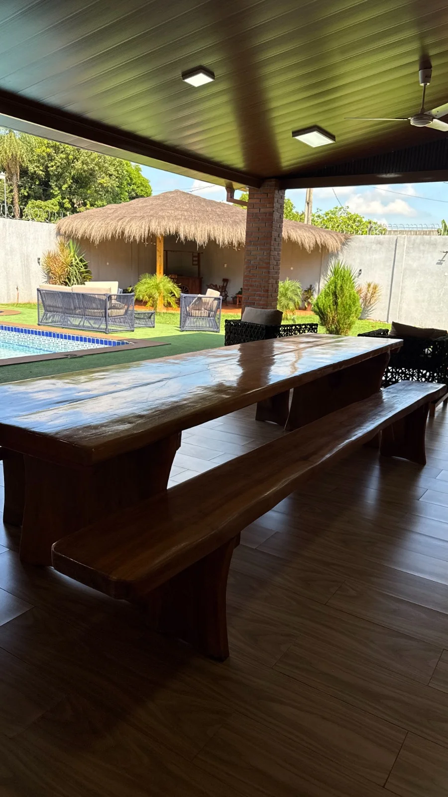 Quincho amplio y totalmente equipado con 2 mesas de madera rustica con sus respectivos bancos, parrilla inox, heladera, cocina, mesas y sillas para el jardín.