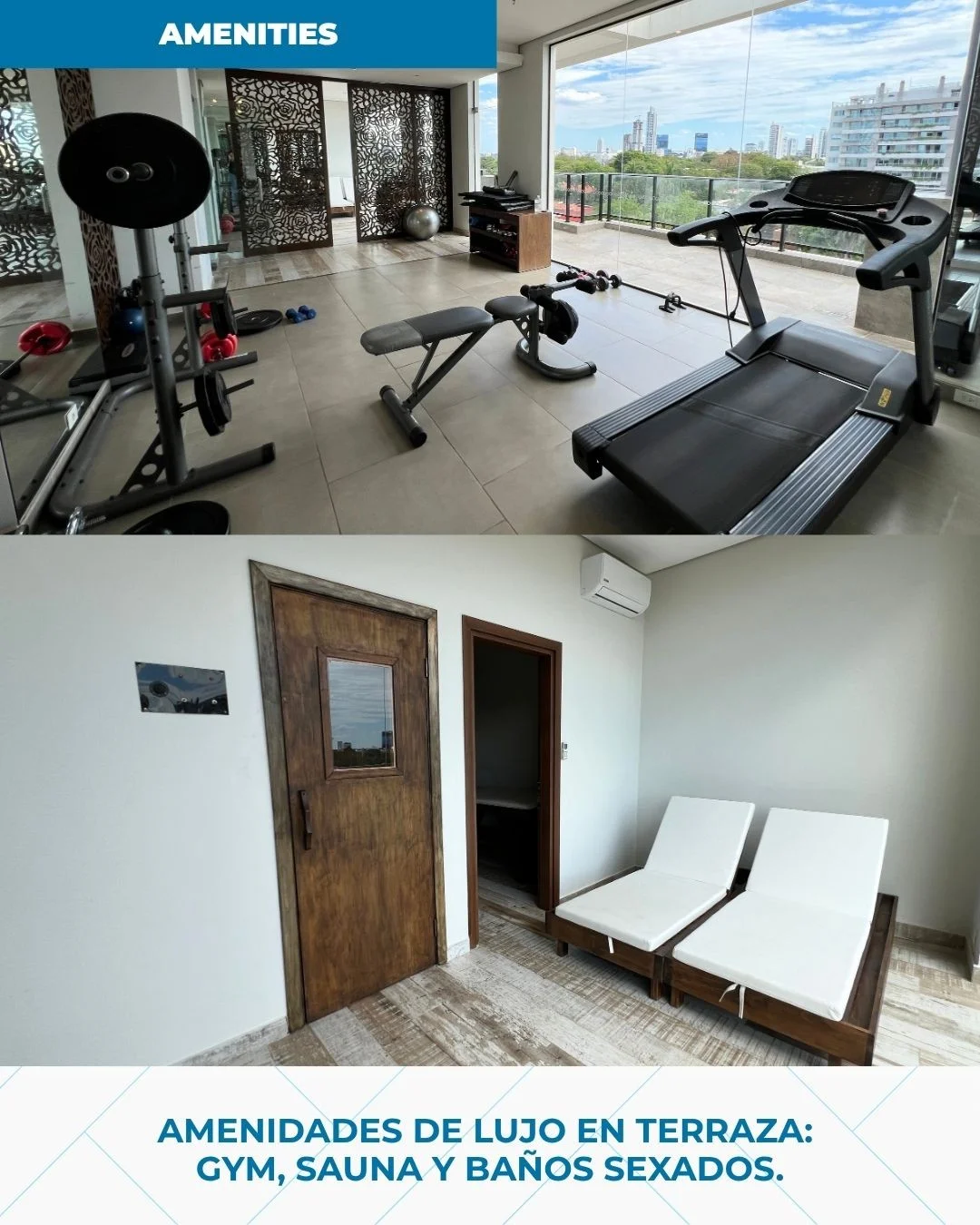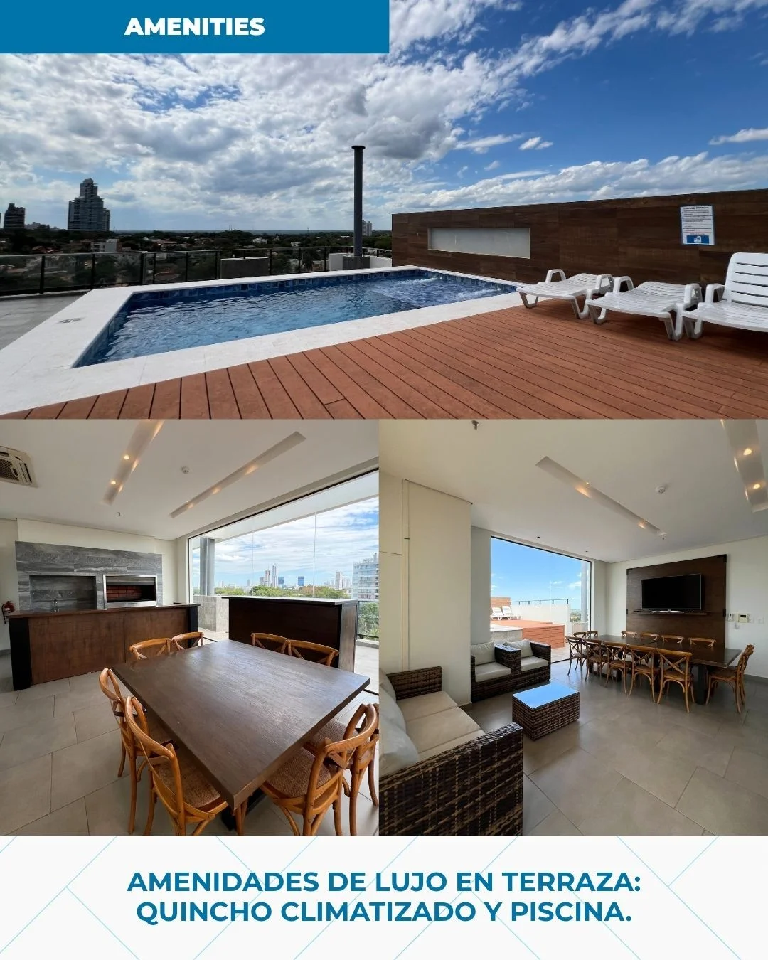 ?♀️Amenidades de Lujo en Terraza: Quincho climatizado con parrilla, gimnasio equipado, sauna, piscina y baños sexados.