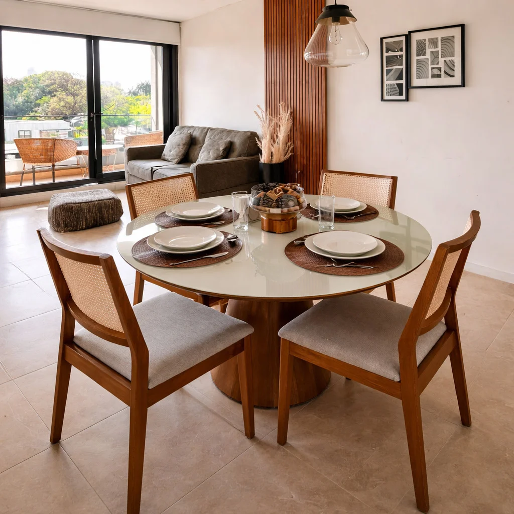Incluye TV, electrodomésticos (heladera, microondas, lavasecarropas), sofá, comedor, cama y mobiliario de calidad.