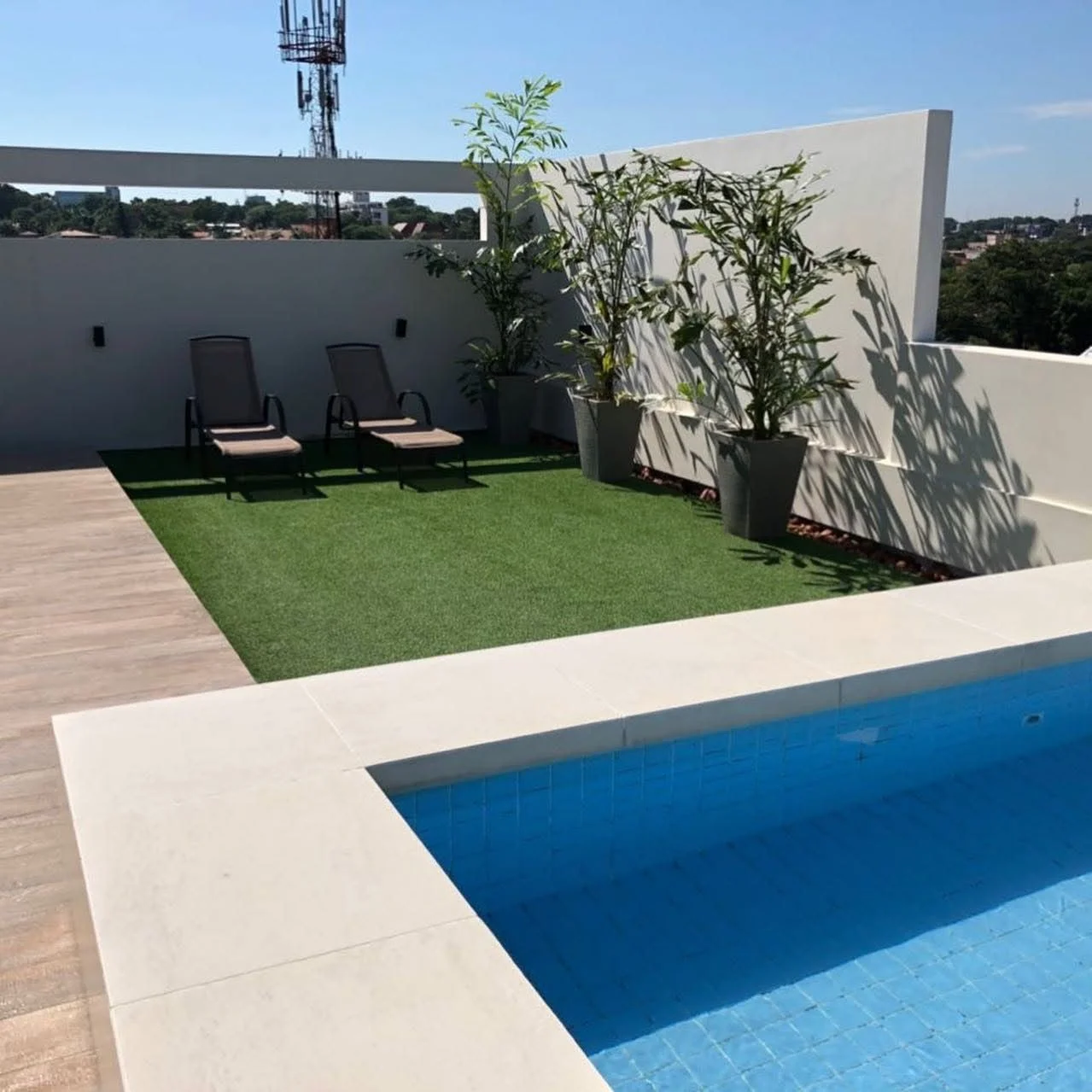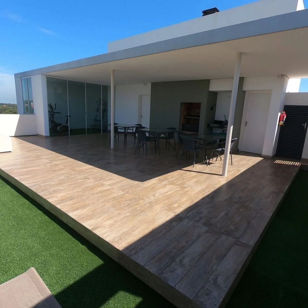 Planta baja: Hall de acceso, recepción, palier de ascensor y escalera de emergencia. Azotea: Piscina, quincho con parrilla, baño y gimnasio.