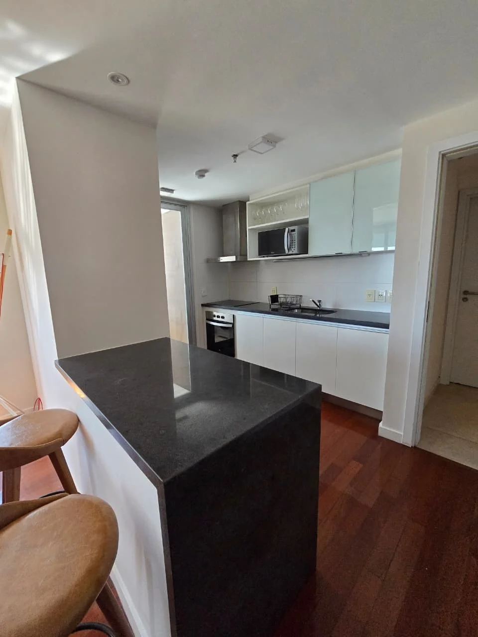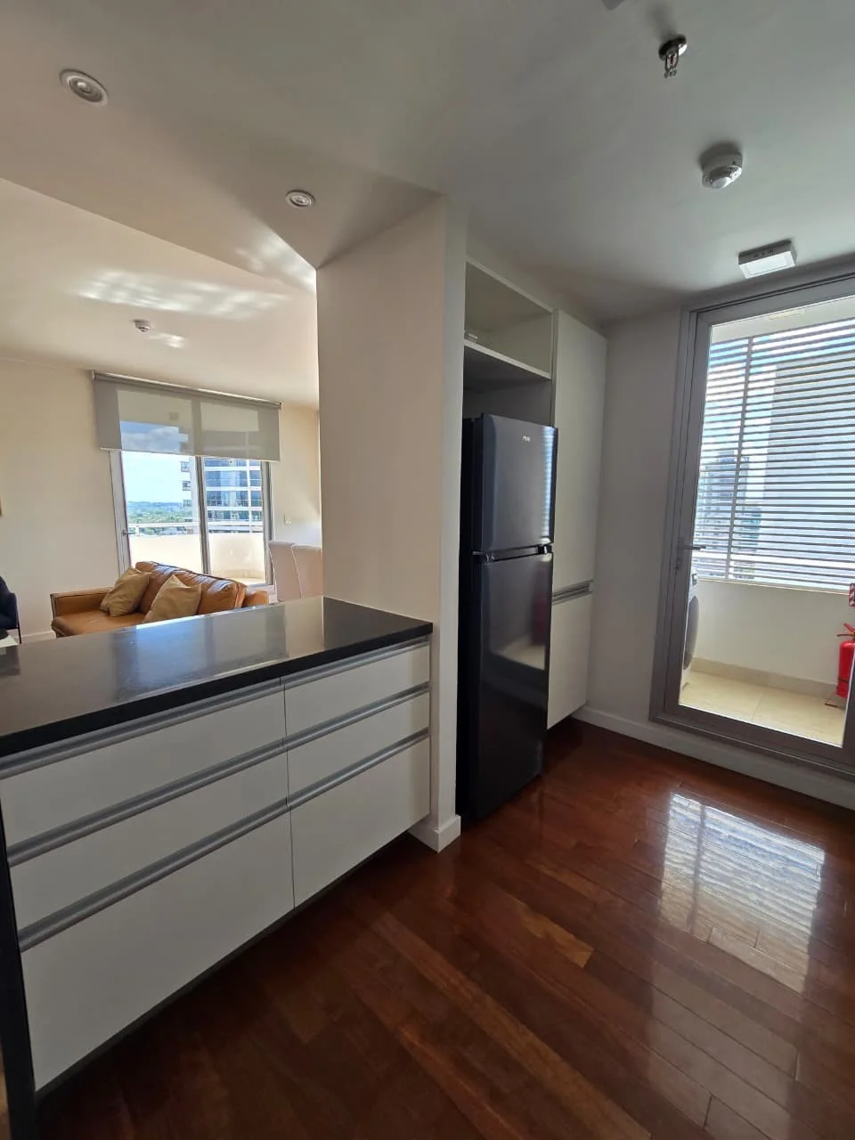 Cocina integrada con living comedor con balcón