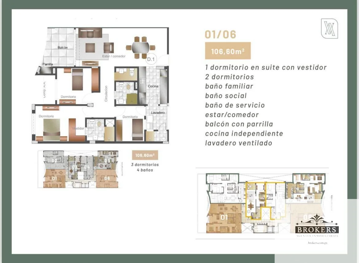 El departamento cuenta con tres dormitorios , uno en suite, vestidor, con placares y aire acondicionado. Los otros dos con baño familiar. Sala de estar. Lindo balcón con parrilla. Un baño social. Cocina amoblada independiente. Cuenta solo con extractor. No tiene horno ni anafe. Lavadero independiente ventilado y Baño de servicio. Hay disponibilidad en el primer y tercer piso. Amenities: Guardia de seguridad Recepción Terraza con piscina, salon multiuso con parrilla, gimnasio, hermosa vista.