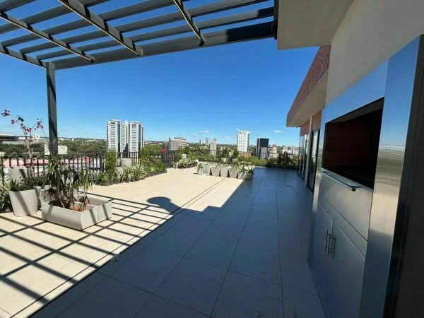 Terraza panorámica con parrilla exterior y vista al eje corporativo