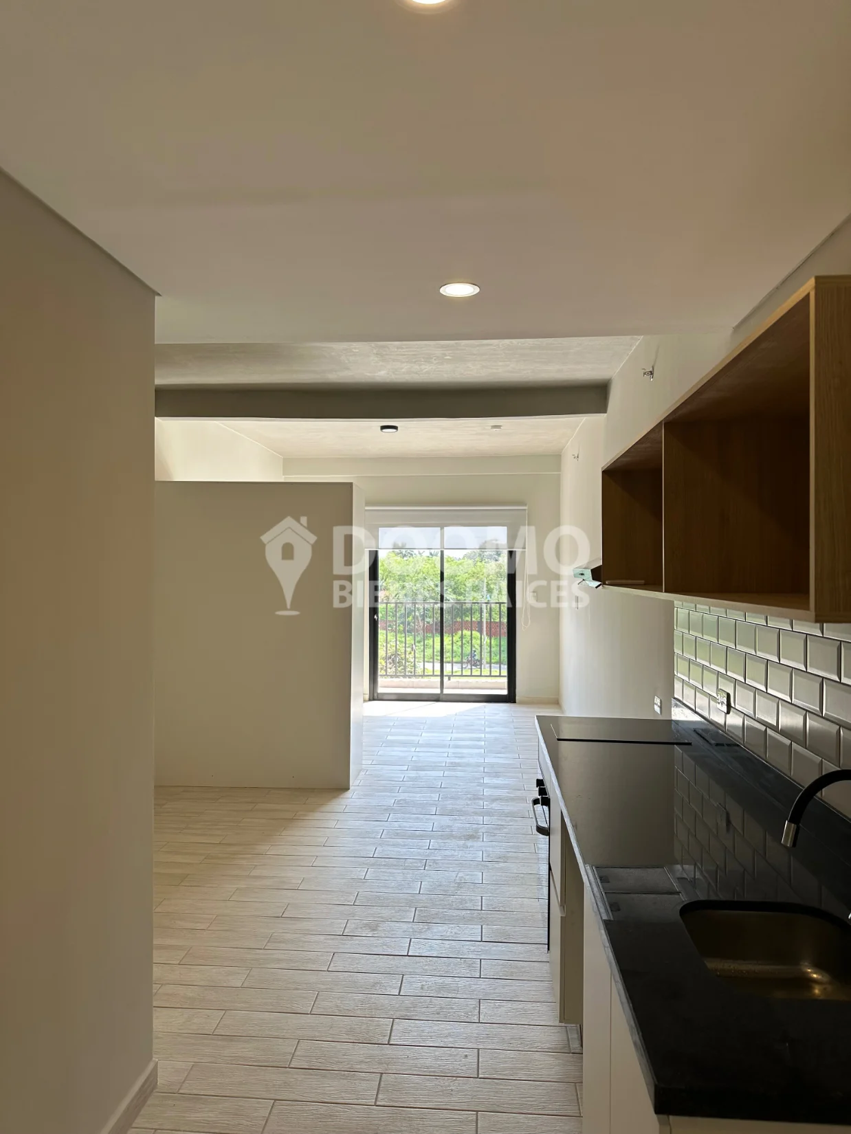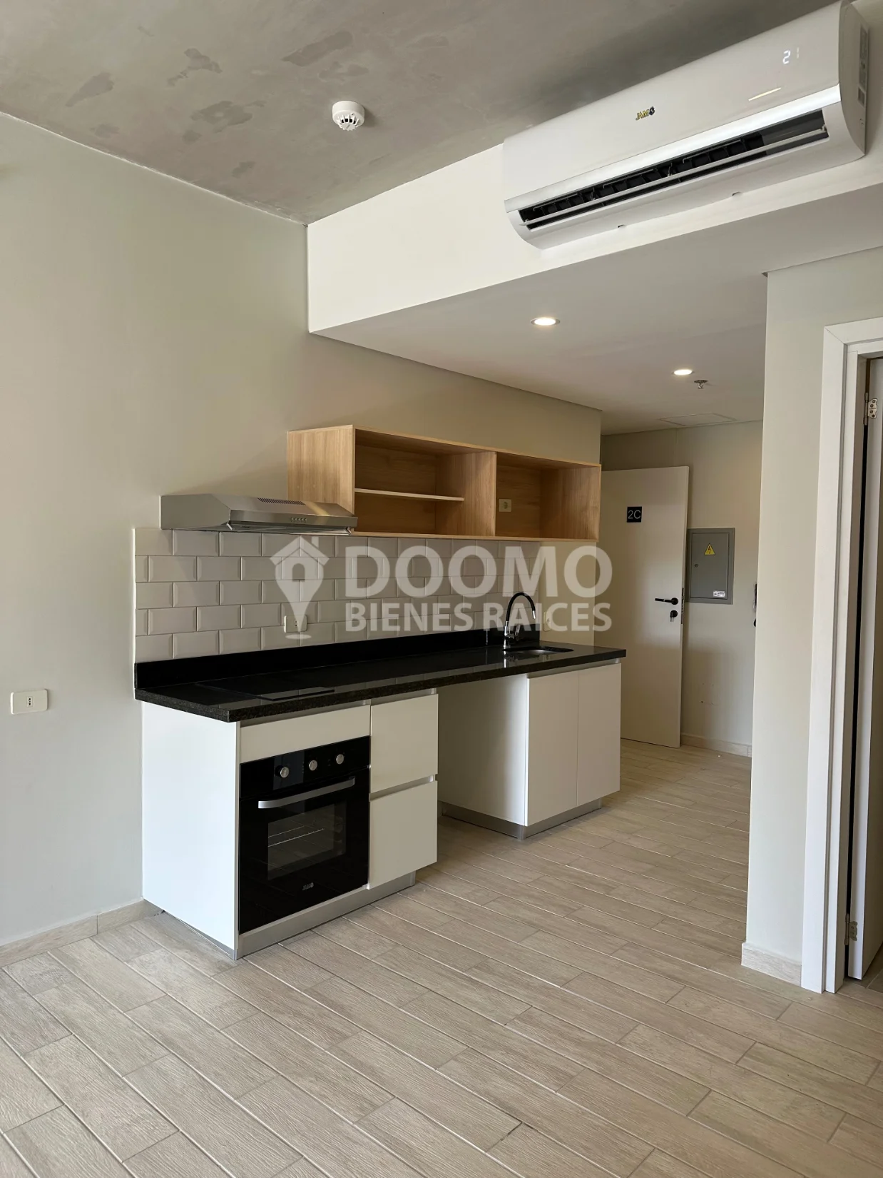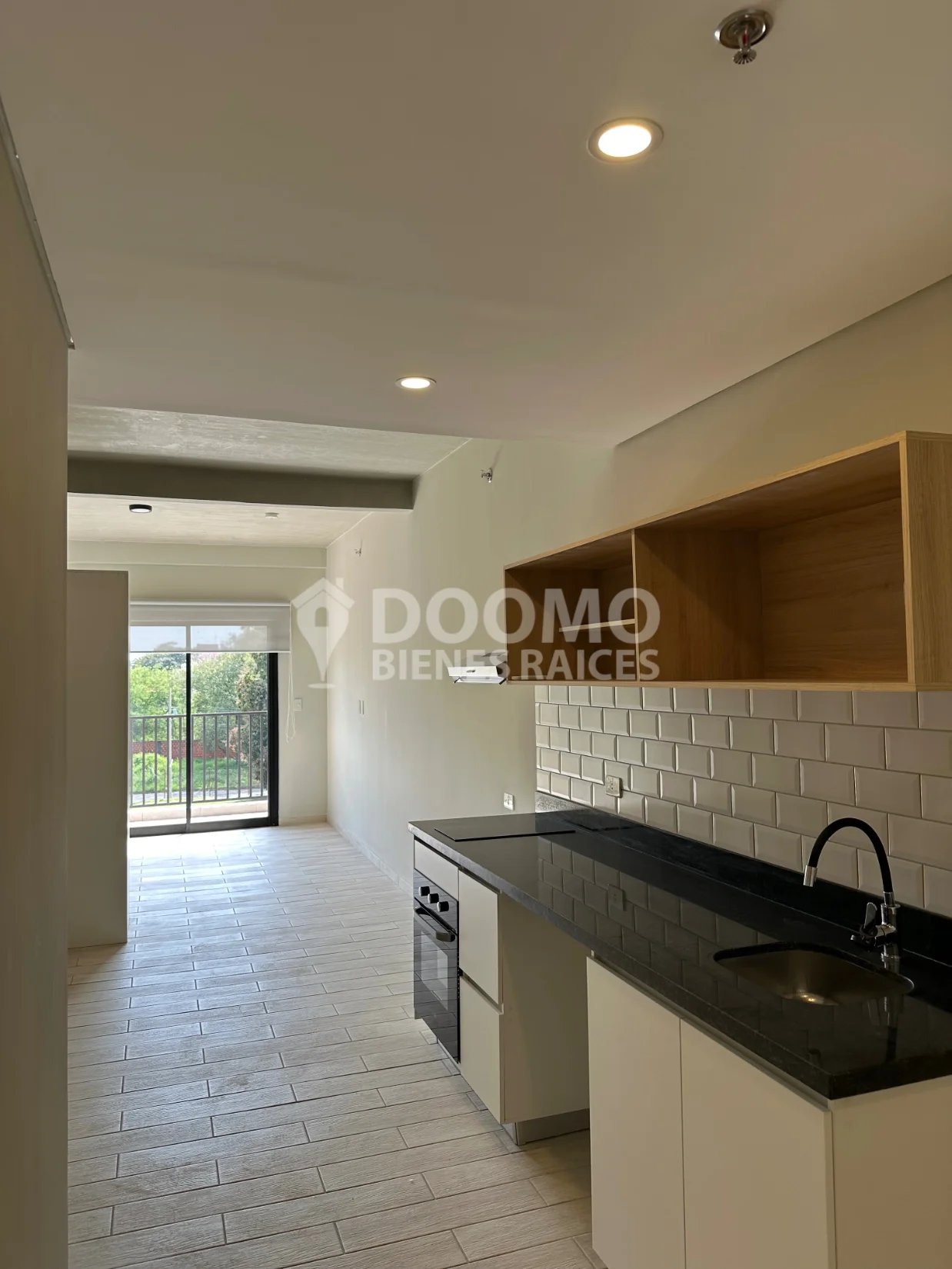 Cocina amoblada en concepto abierto, equipada con anafe, purificador, y horno eléctrico.