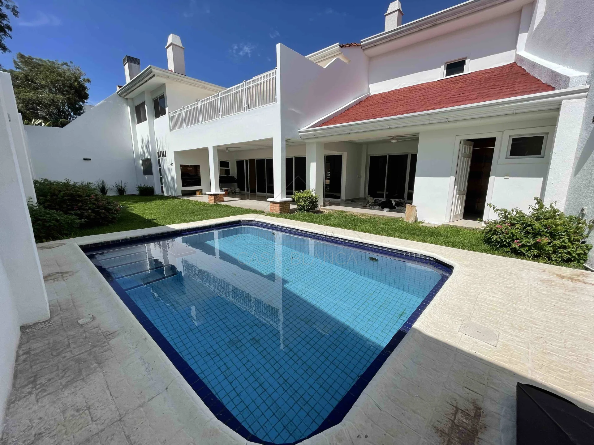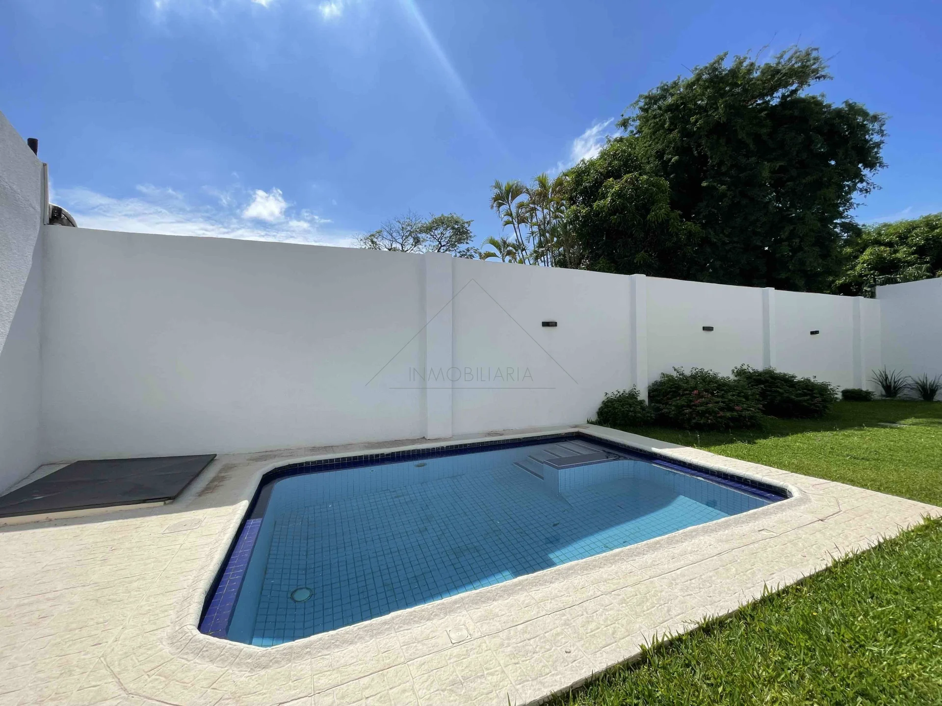 Patio con piscina y parrilla