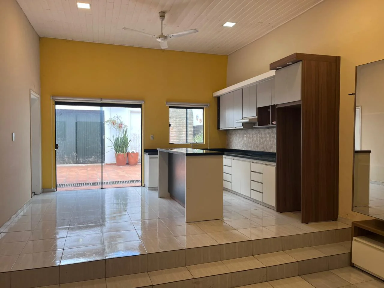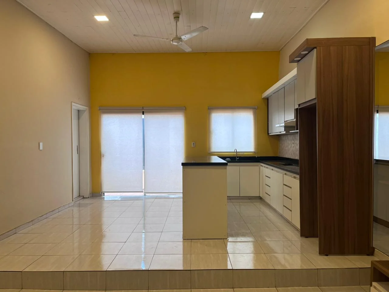 - Sala comedor con cocina amoblada y cortinas antisolares, y ventilador de techo