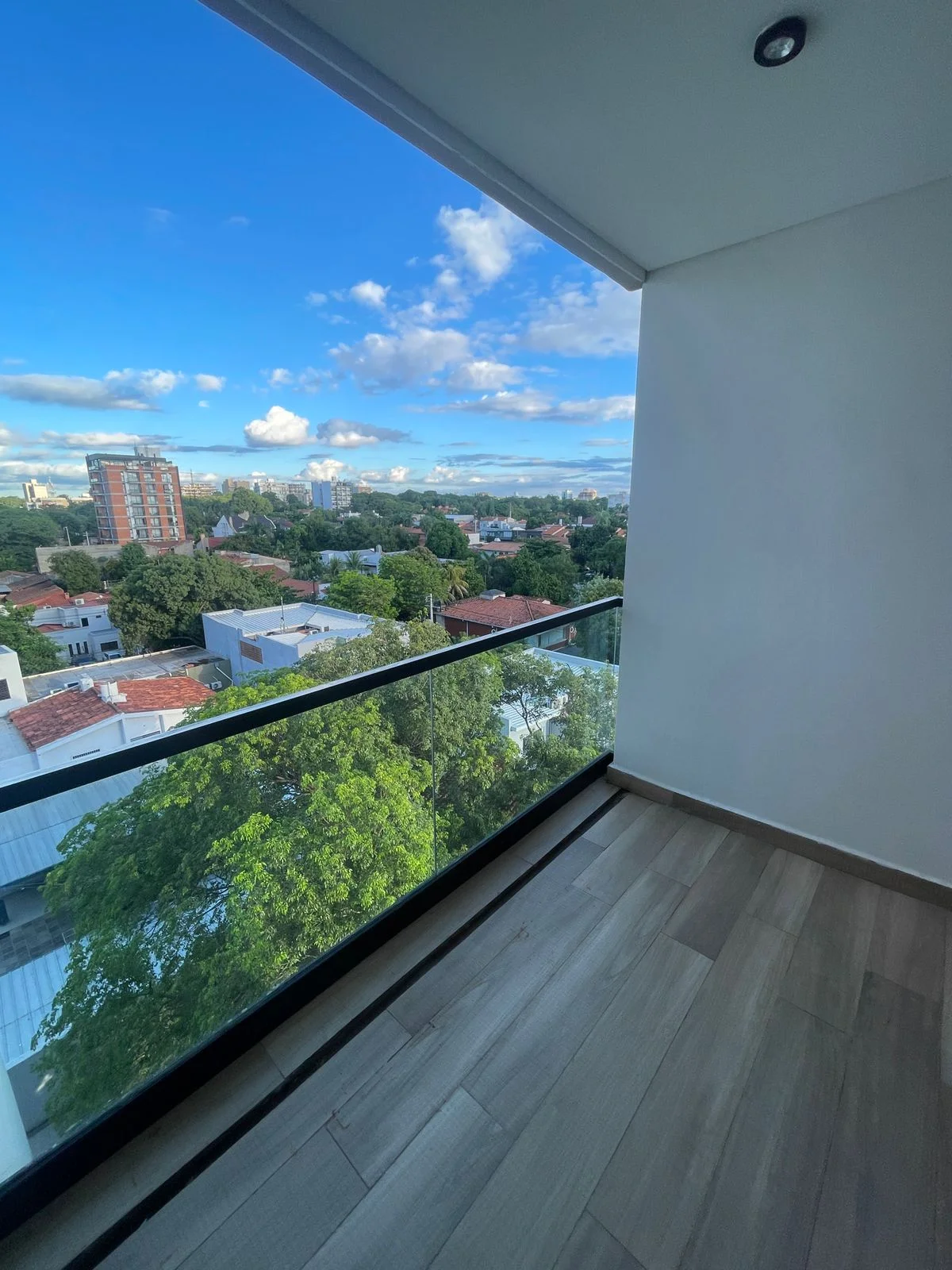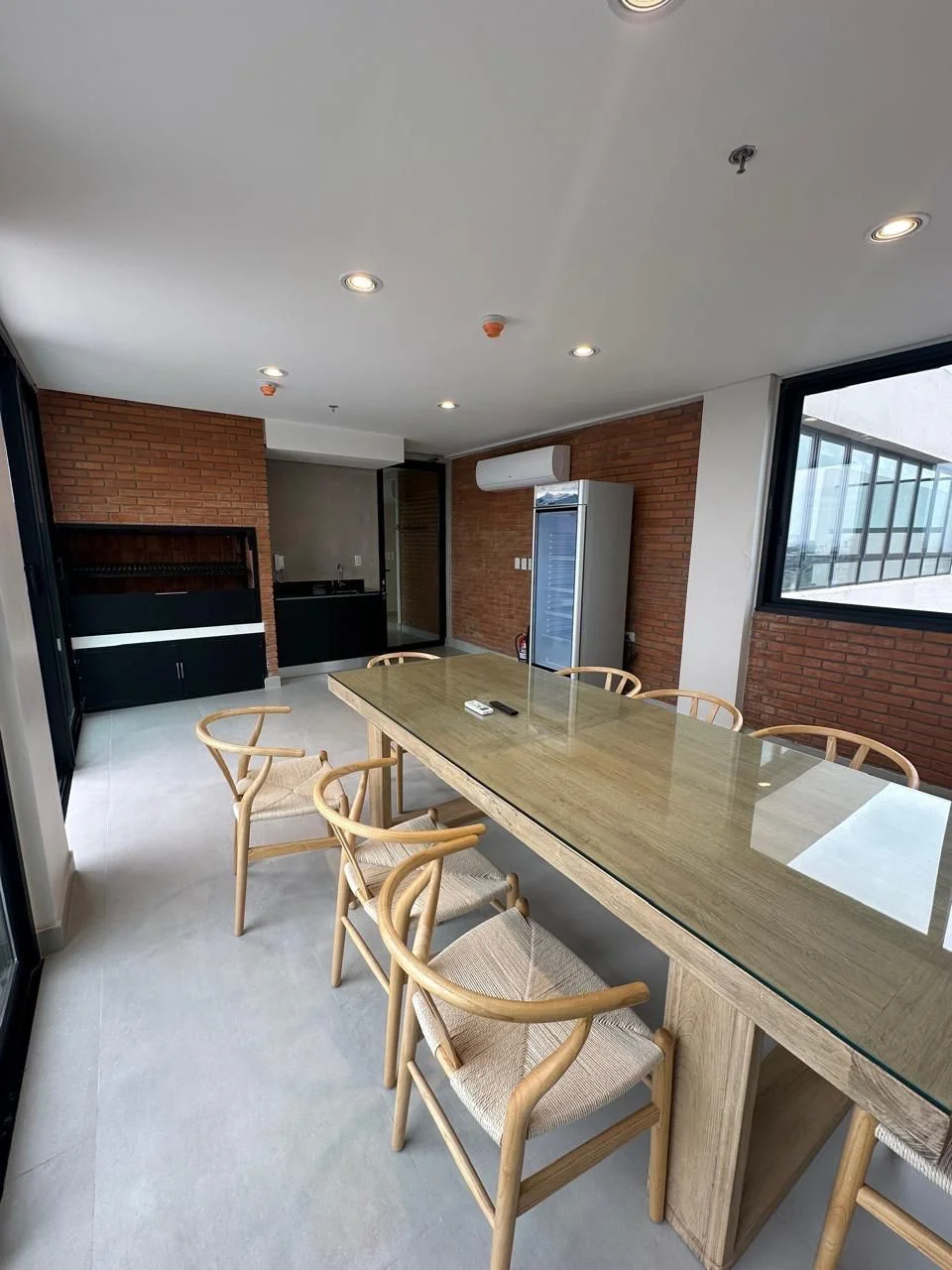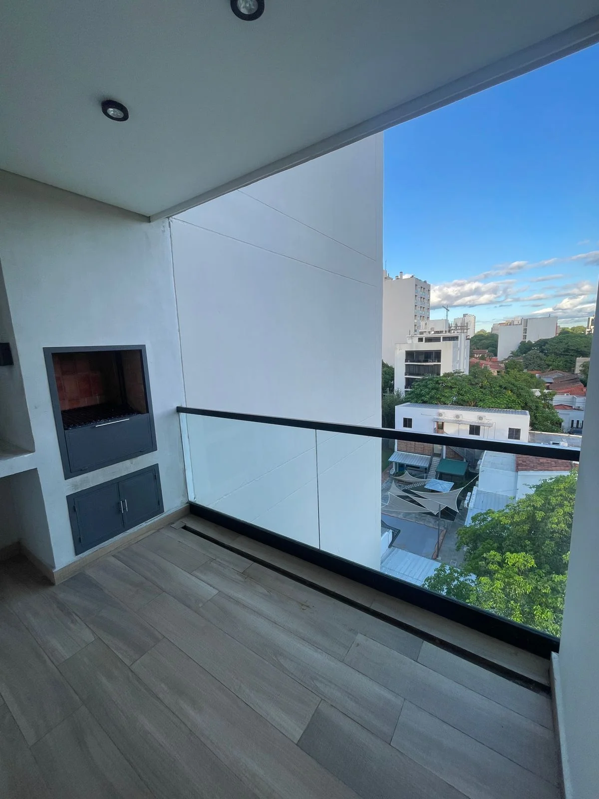Amplios ventanales de piso a techo + balcón con parrilla