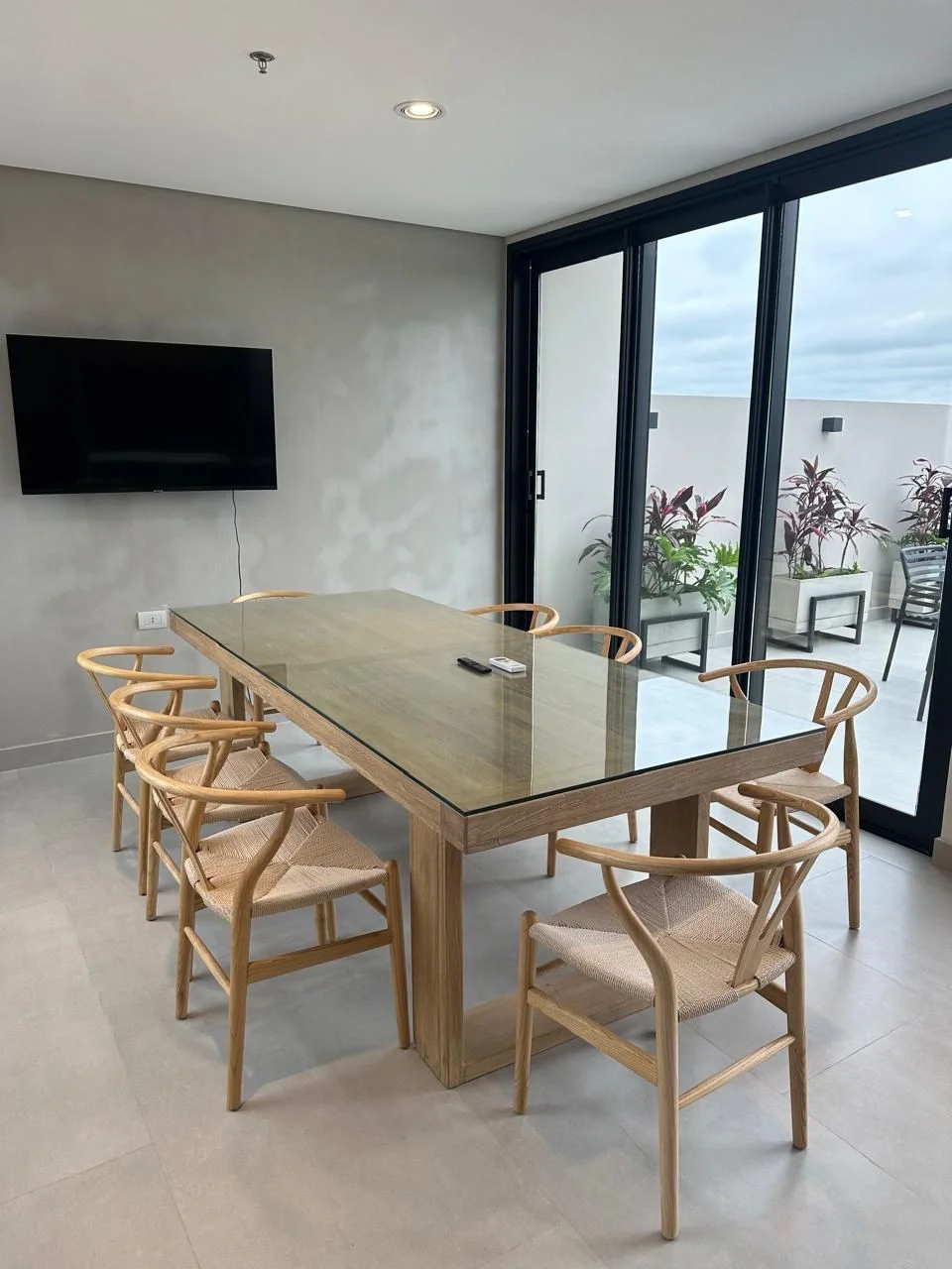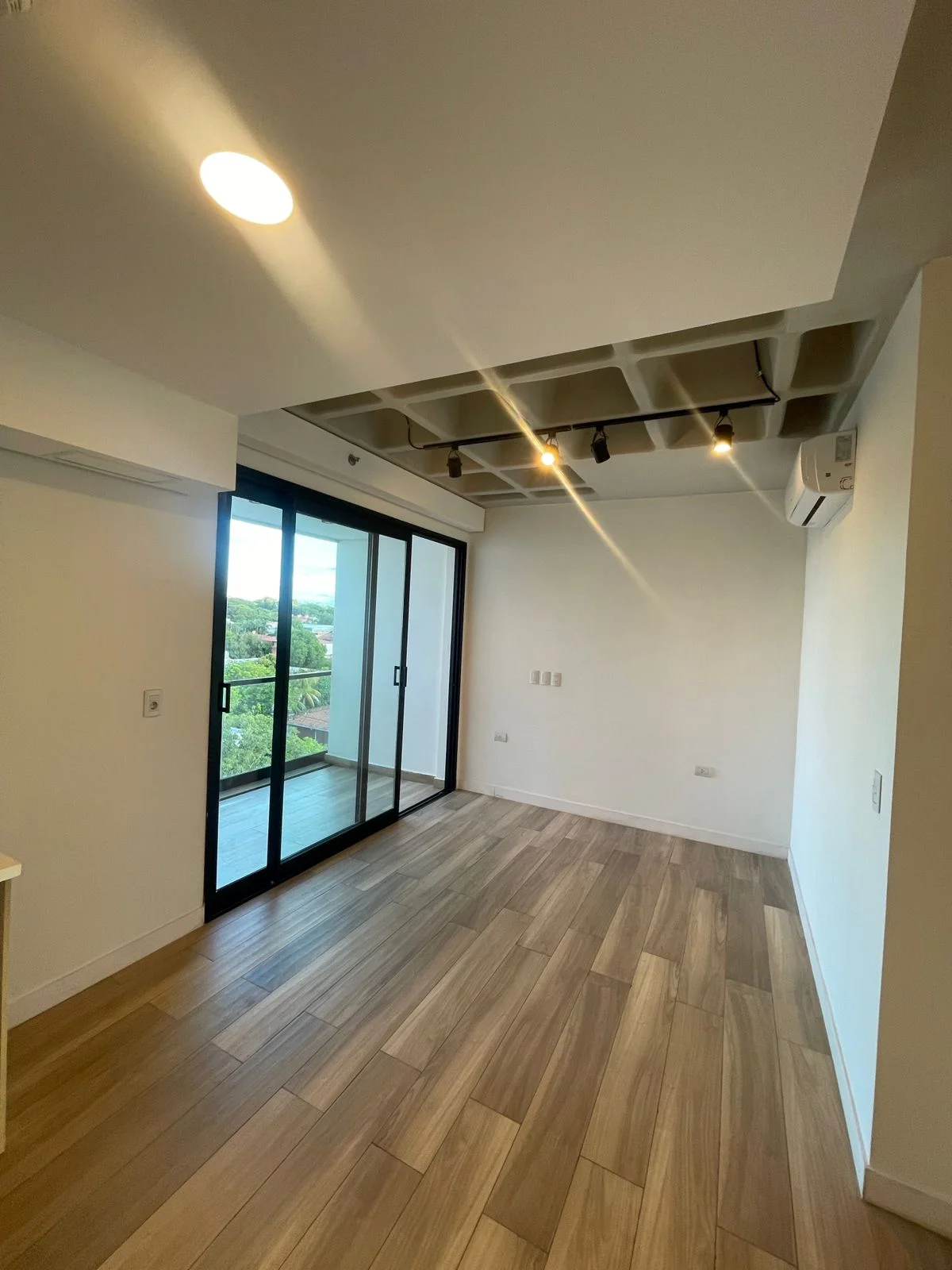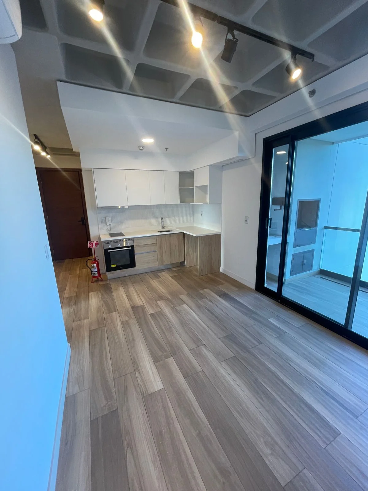 Amplios ventanales de piso a techo + balcón con parrilla