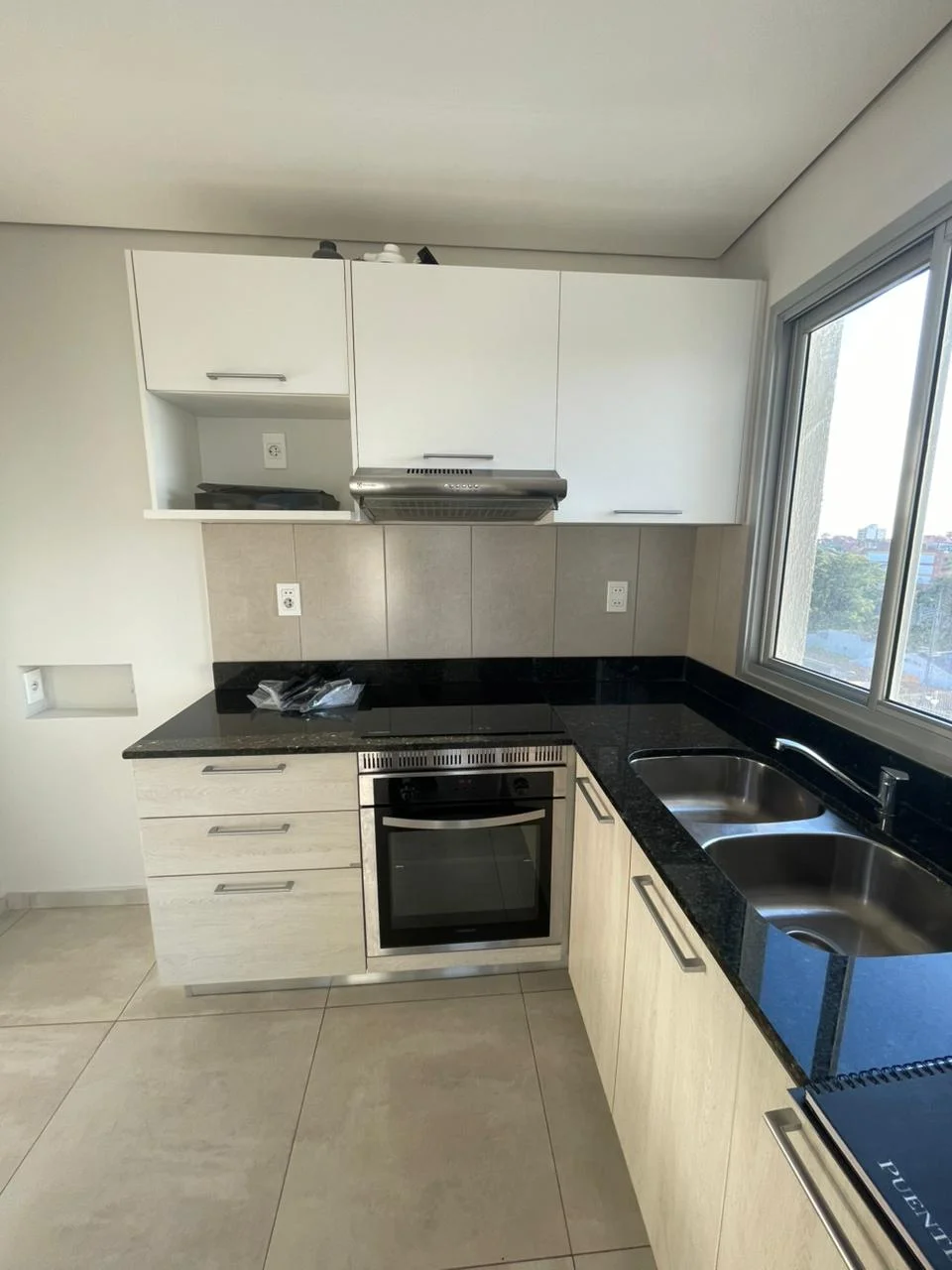 Cocina equipada: horno empotrado, anafe, purificador, alacena y mesada de granito