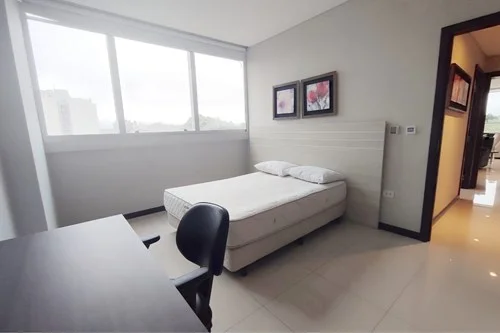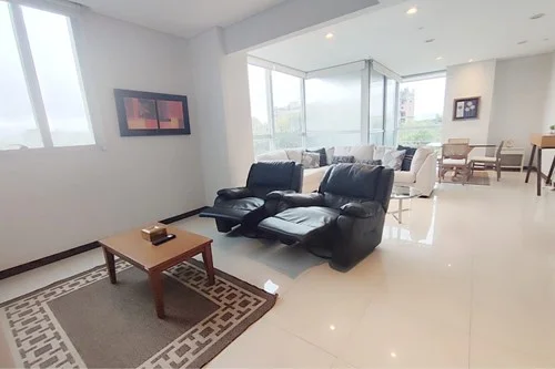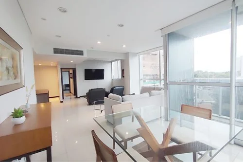 Edificio Miami Tower ubicado en el exclusivo Barrio Villa Morra de Asuncion ,entre las calles Avda Boggiani e/ Gral Ceferino Vega ,a pasos del Shopping Villa Morra ,Shopping Mcal Lopez ,Torre de las Américas entre otros Ubicado en el piso 5 cuenta con 120 m2 ,distribuidos en ambientes amplios y confortables ,amplio ventanal con mucha luz Cuenta con: *Sala *Comedor *Cocina amoblada *área de lavado *1 dormitorio en suite con vestidor *1 dormitorio con A/A y placard * Baño compartido *1 Cochera Área común * Helipuerto * Gimnasio de última generación * Pileta para niños * Área de Juegos * Cancha de Squash * Spa con Sauna y Baño de Vapor * Infinity Poll de 25 m2+ Deck * Terraza Panorámica para fiestas y asados * Tres ascensores para 12 personas cada uno * Tres niveles de Sub Suelo * Servicio de Guardias 24 horas * Domótica: Tecnología avanzada de iluminación, climatización y seguridad instalada en el edificio PRECIO:1350$