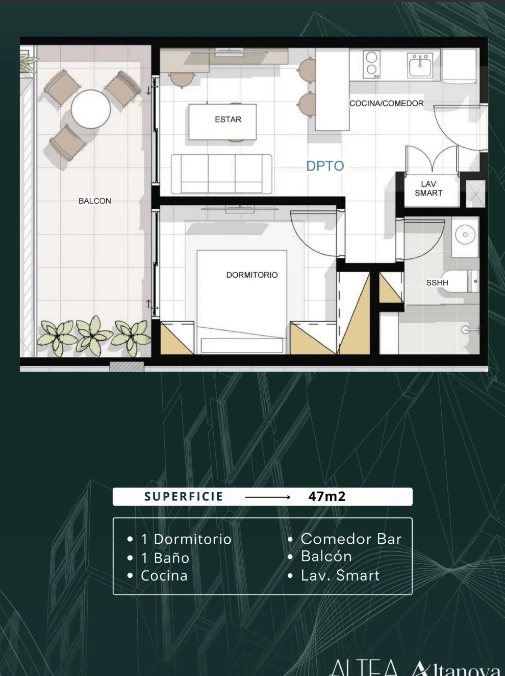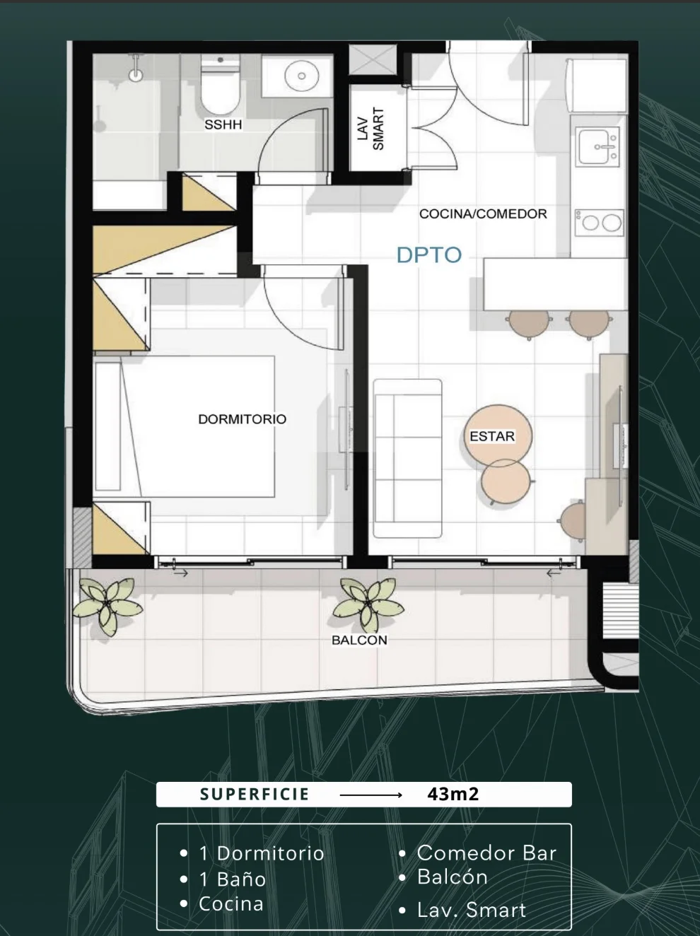 DEPARTAMENTOS DE UN DORMITORIO CON SUPERFICIES DE 43m² Y 47m²
