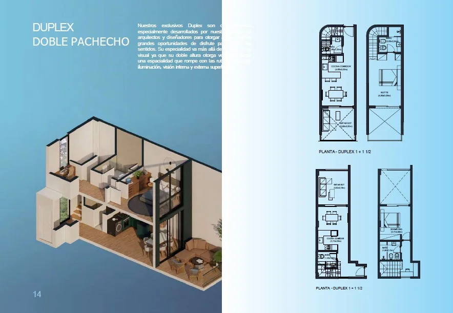 Tipología Dúplex: Esta tipología es considerada el modelo estrella está pensado para el inversor porque en una ciudad donde se está construyendo mucho es una unidad que se diferencia de los demás. Esta tipología de distribución genera alta demanda para alquileres temporales de plataformas como AIRBNB