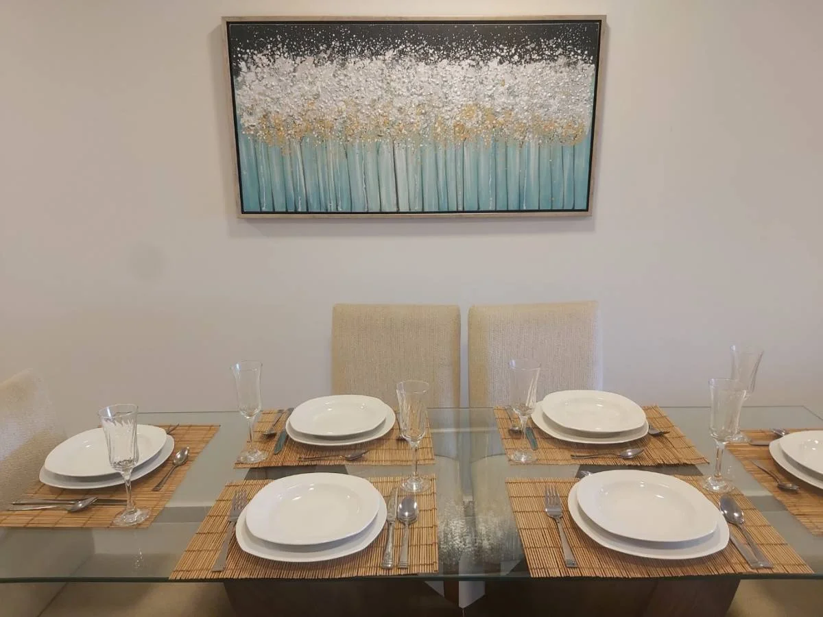Sala comedor con sofá cama, TV de 49', mesa con 6 sillas. Vajilla completa (platos, cubiertos, copas, vasos, tazas).