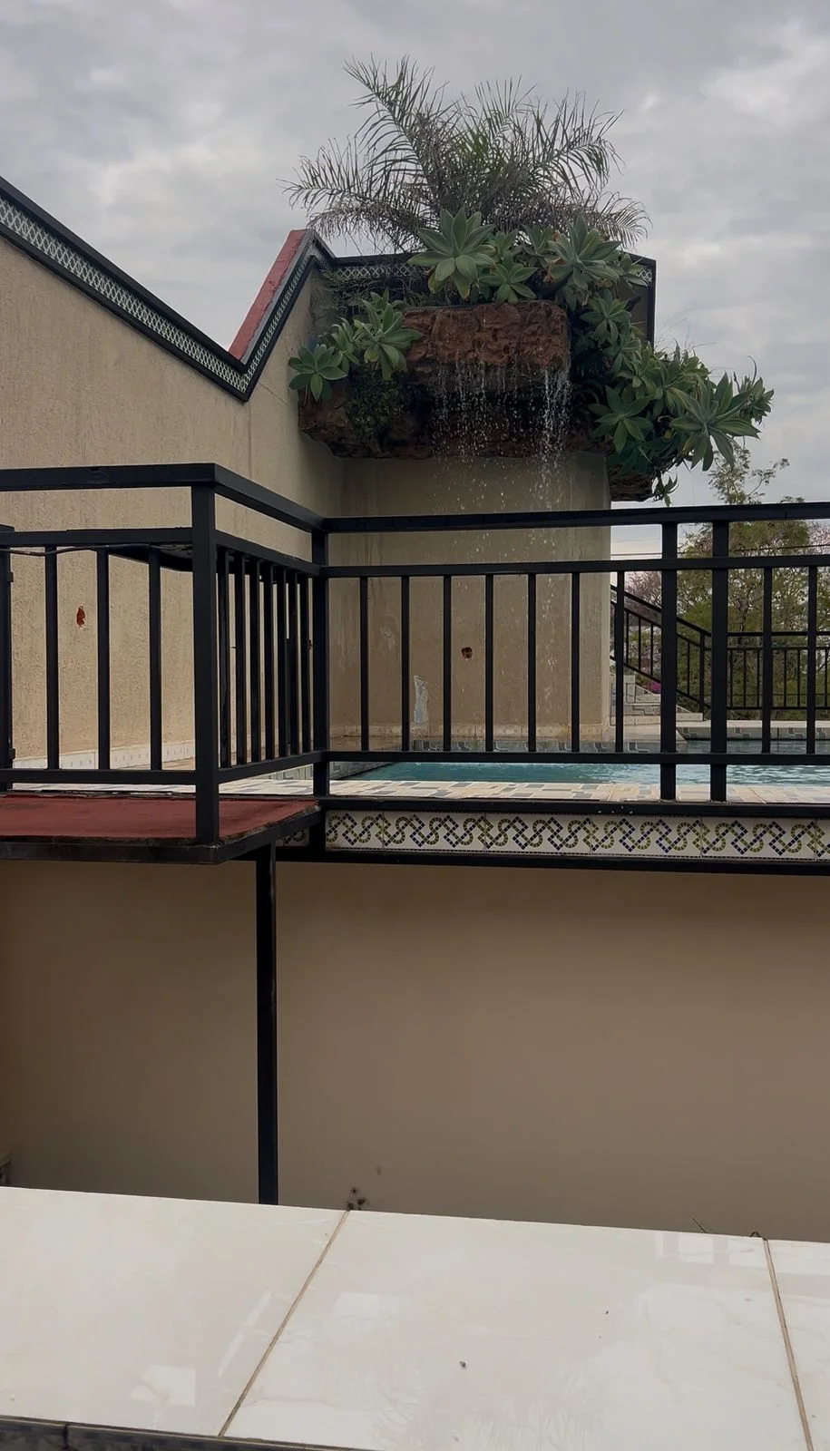 * Balcón con parrilla privada y vista a la piscina del condominio