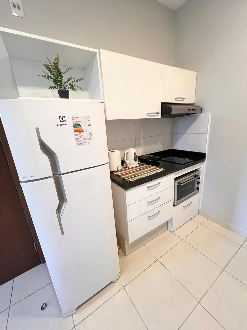 . Cocina amoblada marca Achon y equipada con anafe vitroceramico y extractor inoxidable