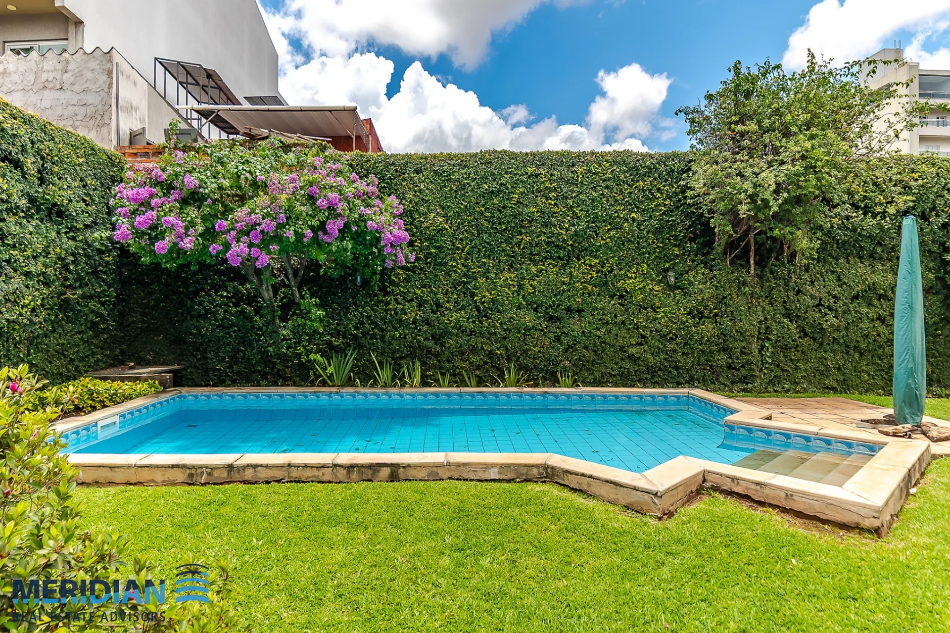 • Piscina rectangular con solarium y jardín perimetral