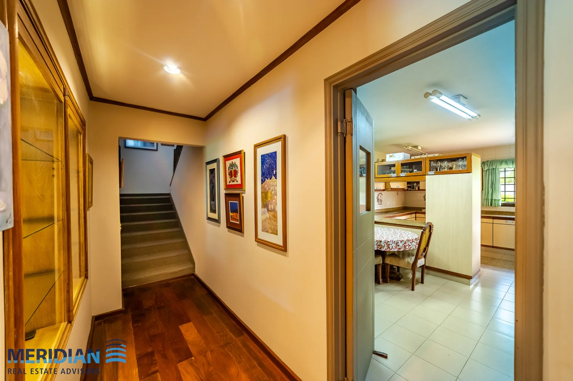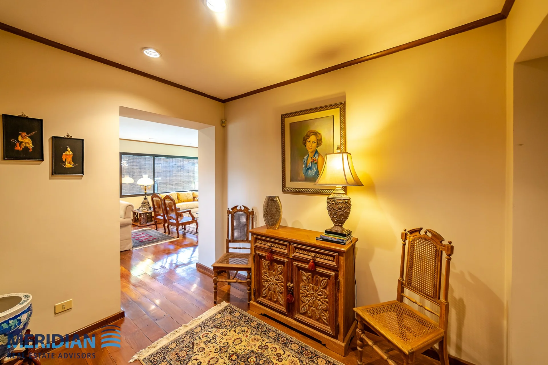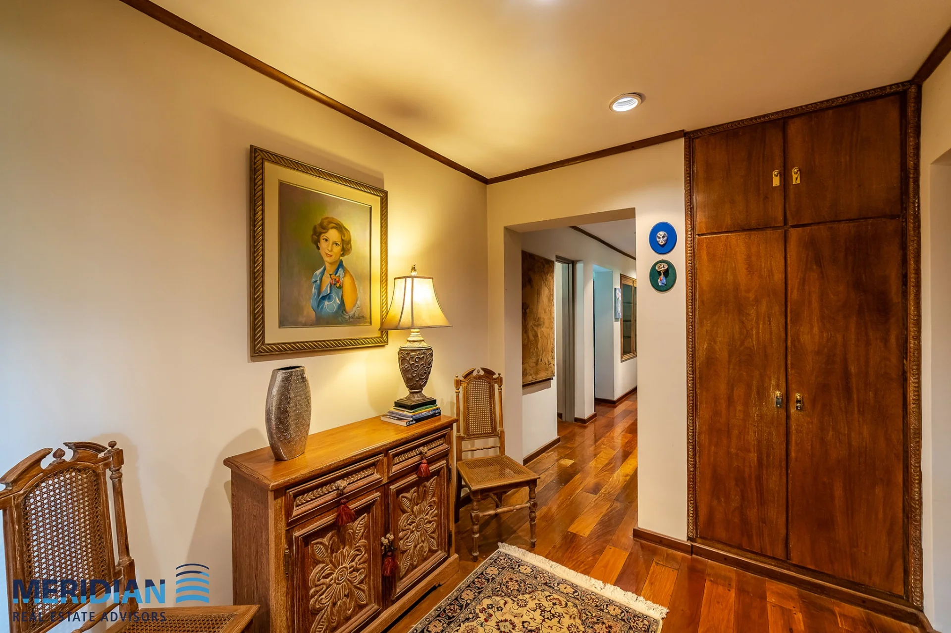 Acceso mediante escalera de madera con pasamano trabajado, que desemboca en un hall superior con iluminación natural y galería de arte.