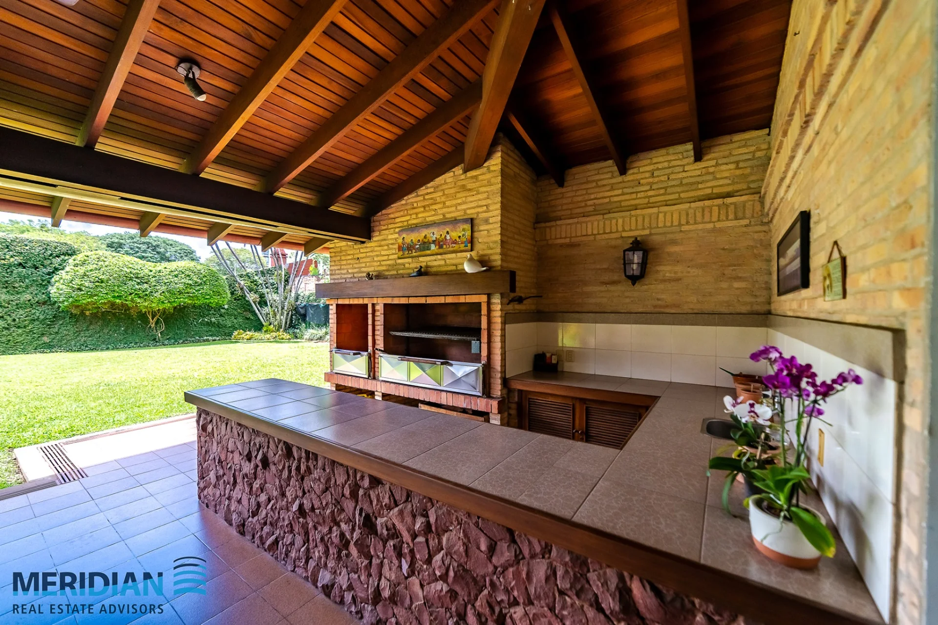 • Galería de entretenimiento cubierta con techo de madera , parrillero de piedra natural, barra exterior y ventiladores de techo