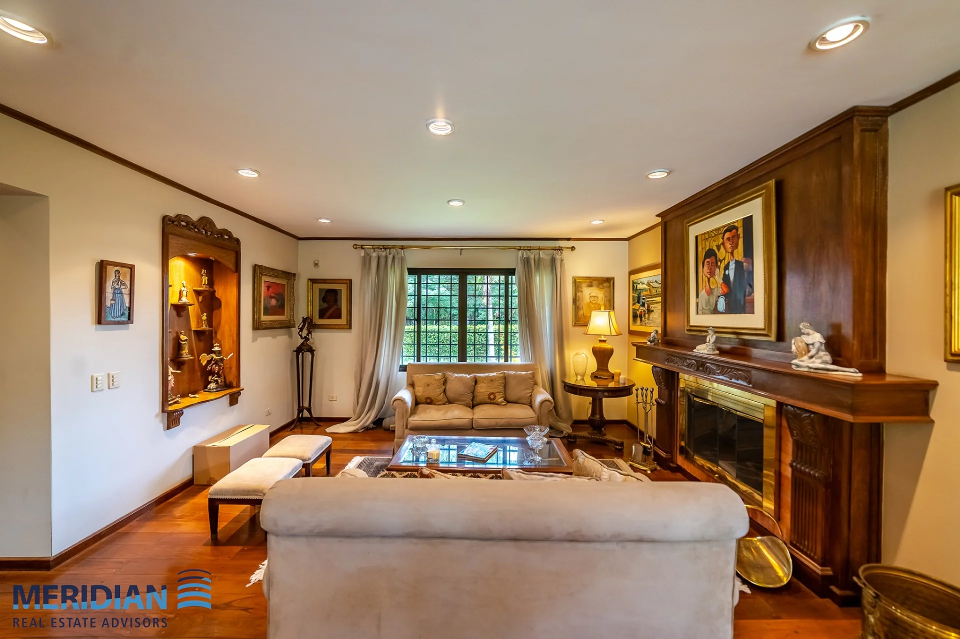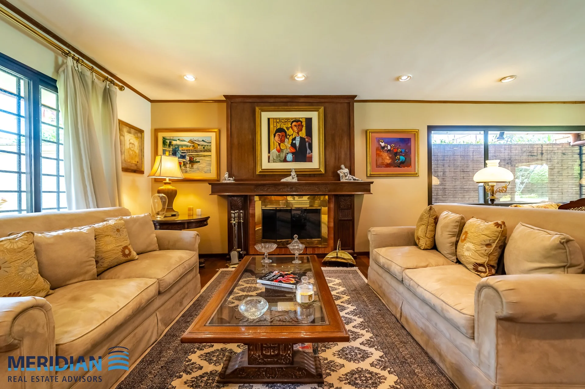 • Living principal con chimenea de madera y acceso visual al jardín