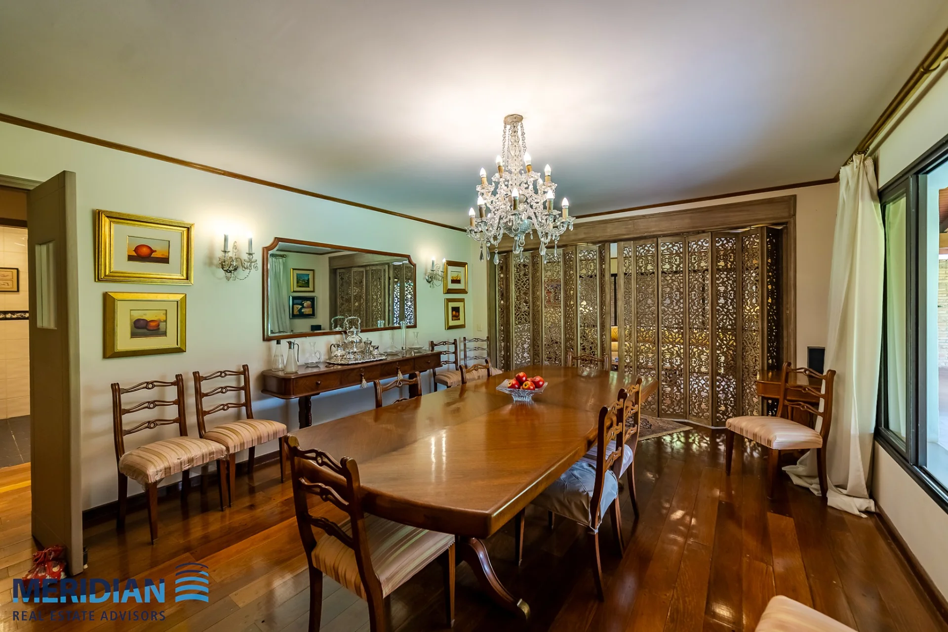 • Comedor formal para 10 personas, con lámpara de araña de cristal y acceso a galería exterior
