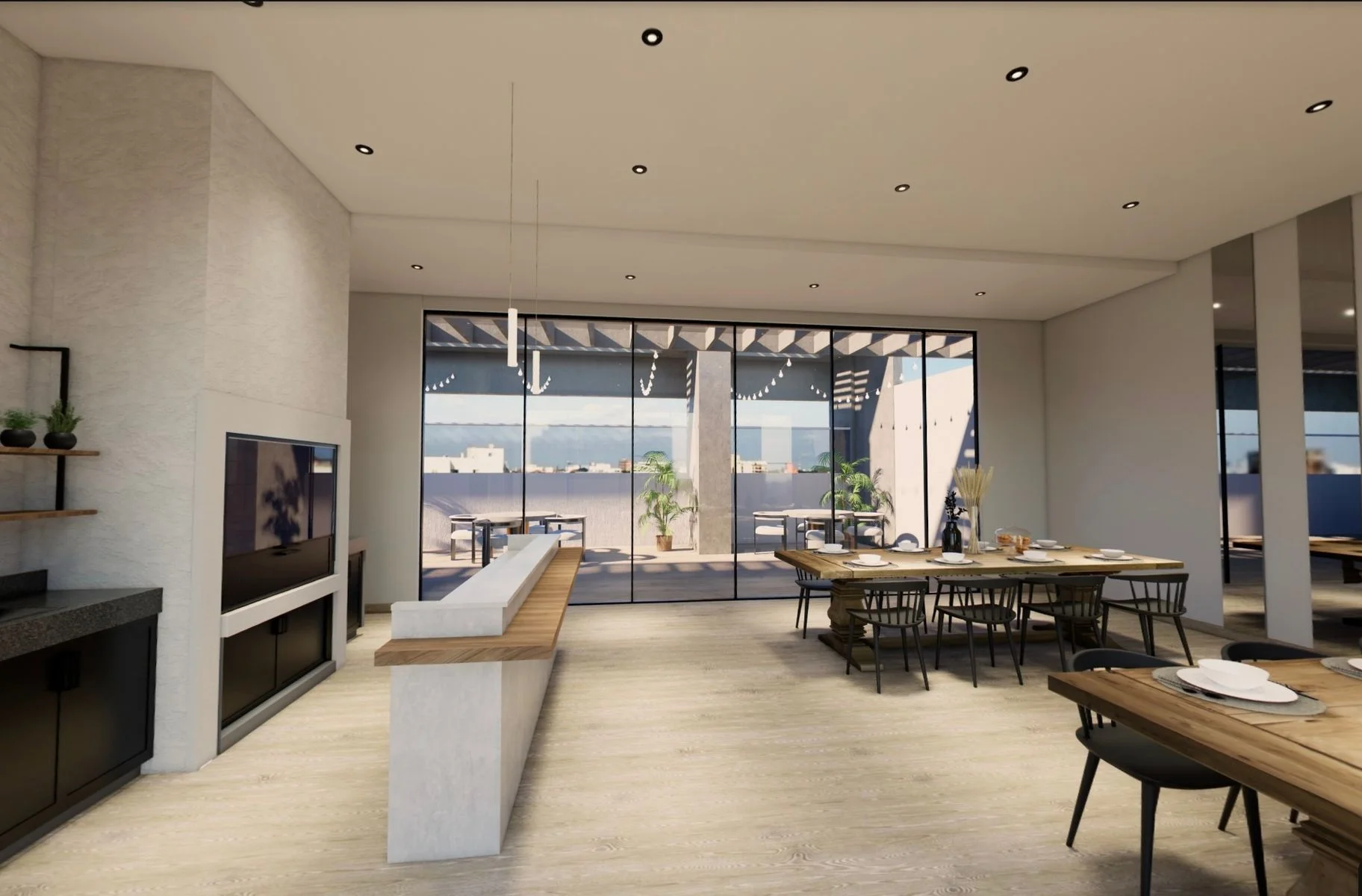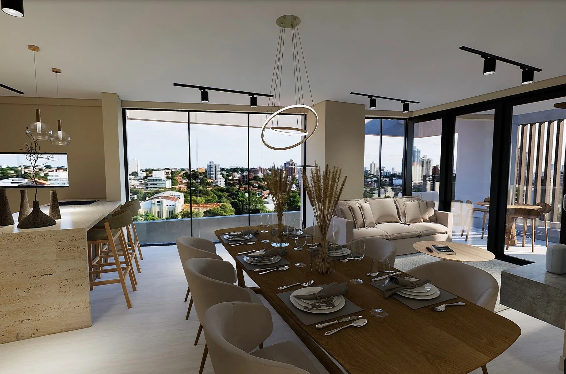 - Finas terminaciones: porcelanatos de gran formato, puertas de madera lustrada, vidrios DVH, parasoles metálicos diseñados.