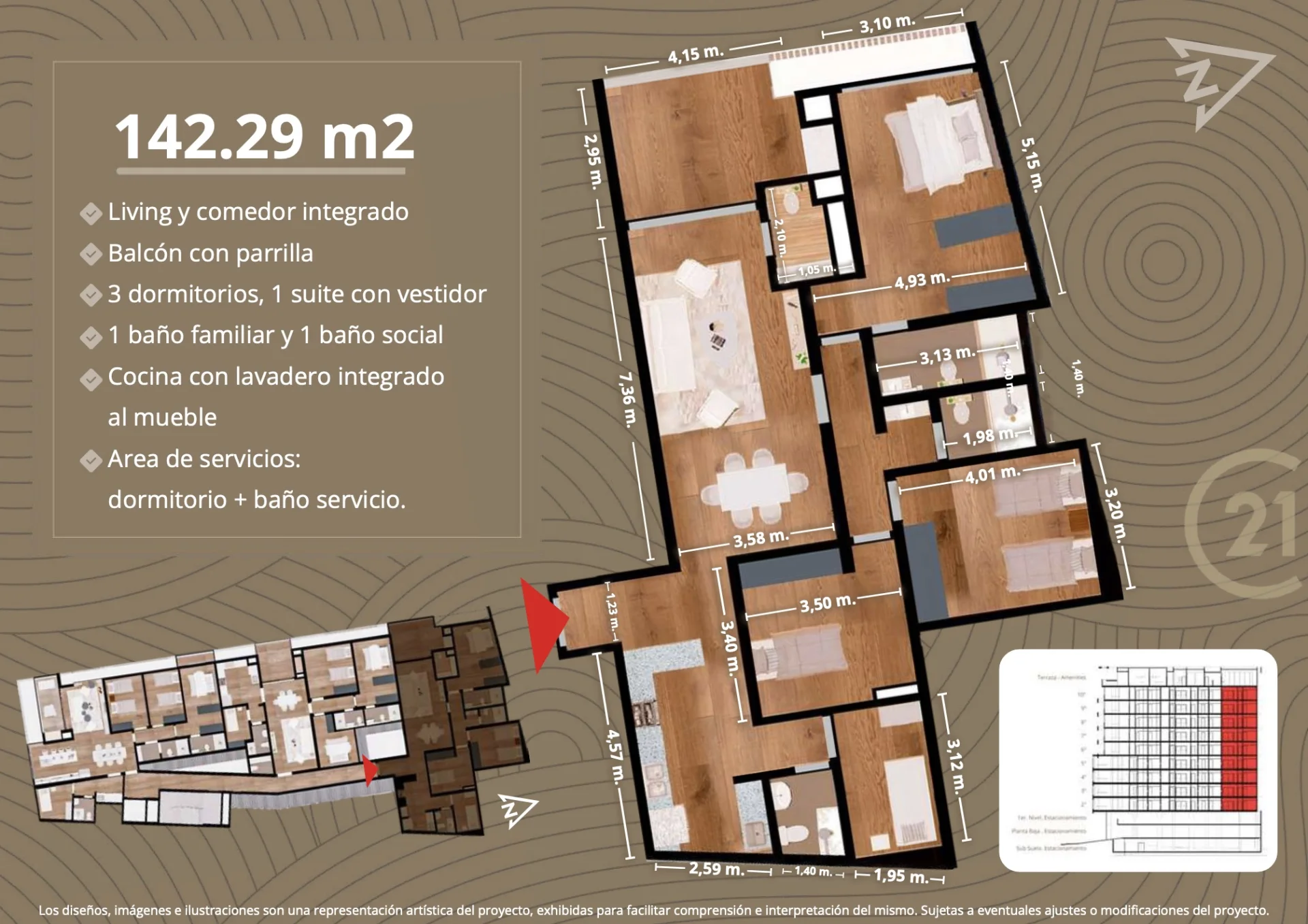 27 departamentos de 3 dormitorios con área de servicio, de entre 118m2 y 147m2 propios.