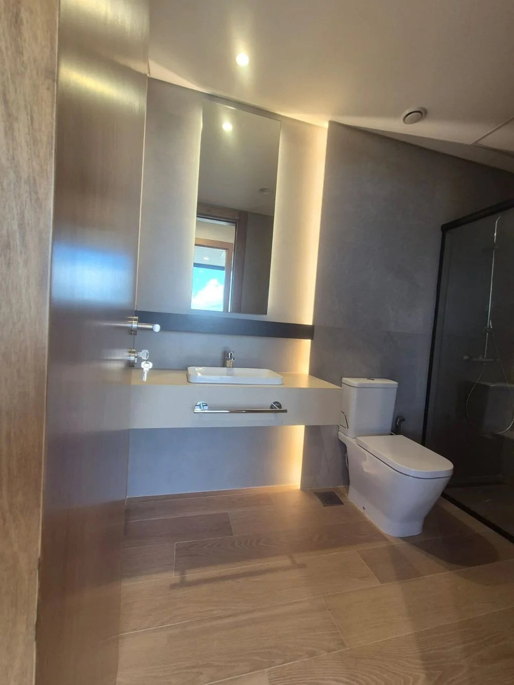 Baño con espejo e iluminación difusa