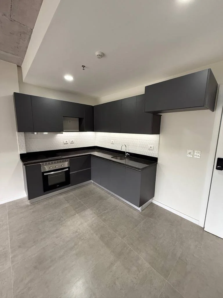 Cocina completa, con mesada, muebles, horno, anafe y extractor.