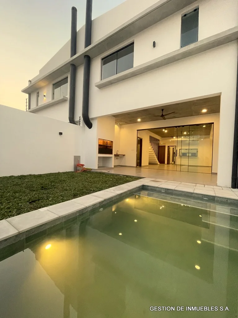 PB: cochera para dos vehículos, sala/comedor, cocina amoblada, galería con parrilla, patio empastado y piscina. Area de servicio completa.