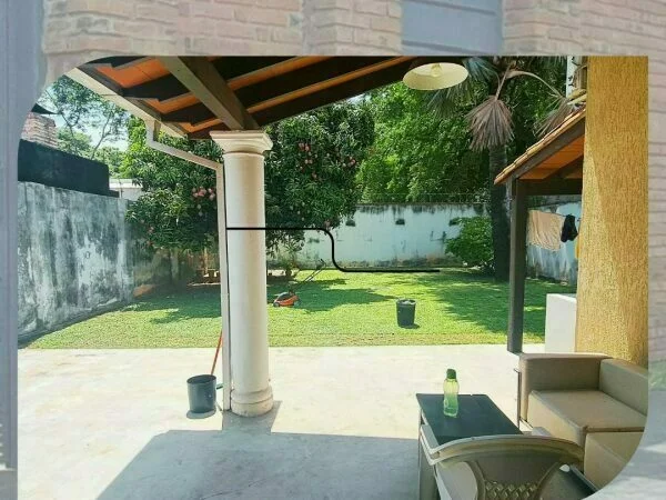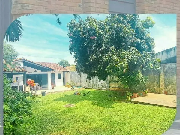 Patio trasero: 12 x 12 m de césped con una palmera imperial y árboles frutales (acerola y mango brasileño).