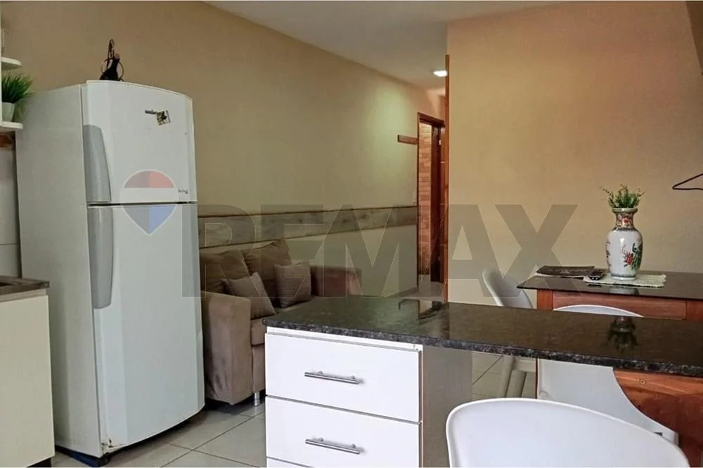 ???? Sala con sofá de 2 asientos y cocina tipo cocina con muebles, cocina a gas, extractor y heladera con congelador.