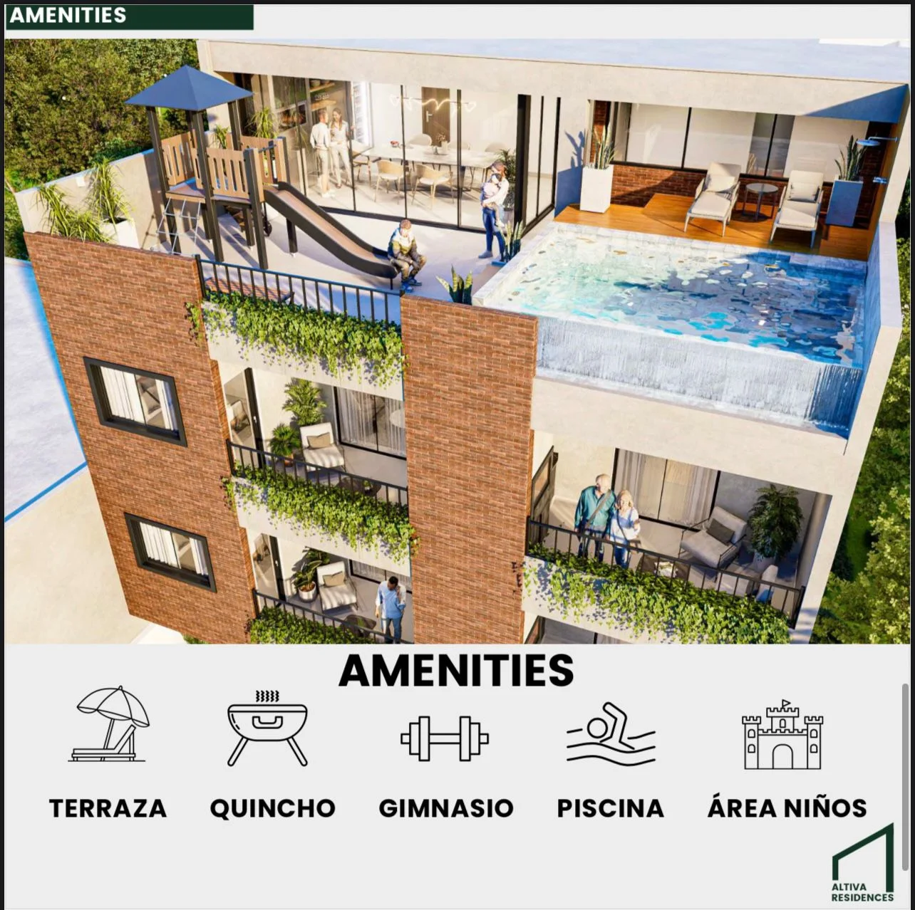 Amenidades: quincho climatizado, gimnasio, piscina y juegos infantiles.