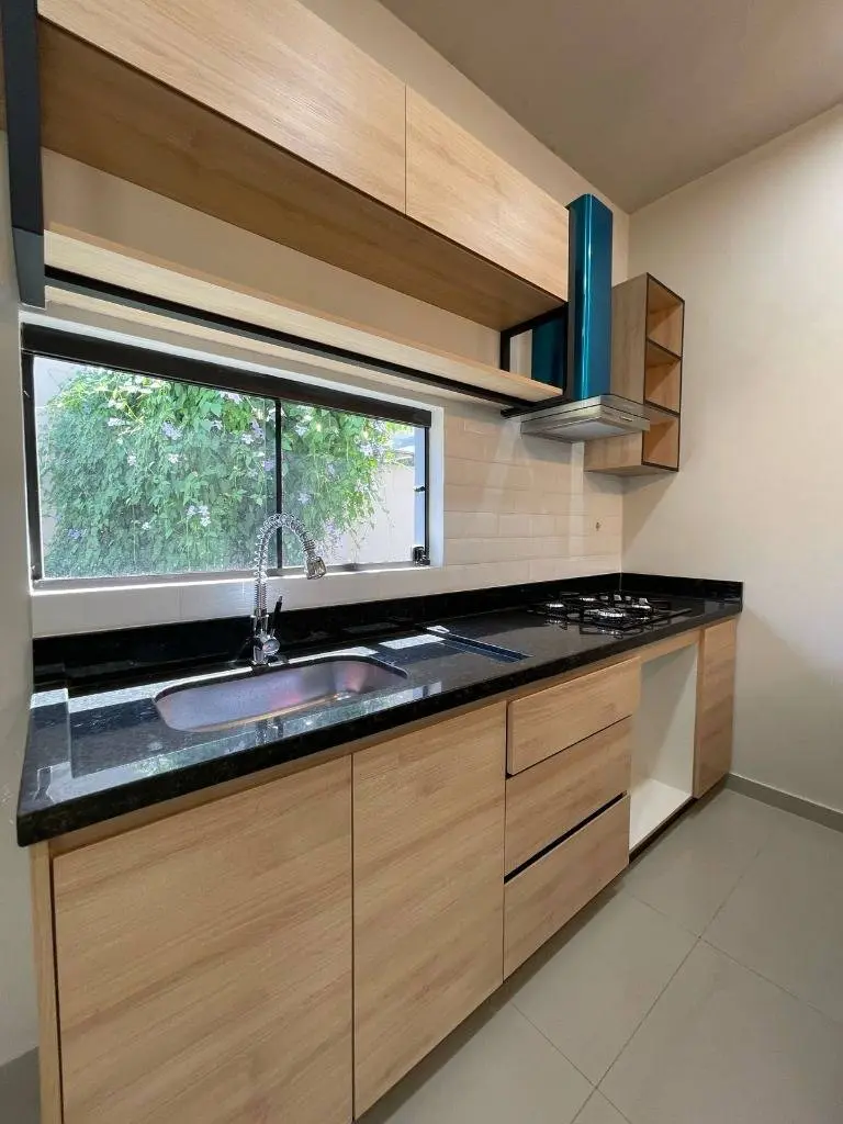 - Cocina–comedor integrados, equipados con mesada de granito, anafe, extractor, muebles altos y bajos y grifería línea premium