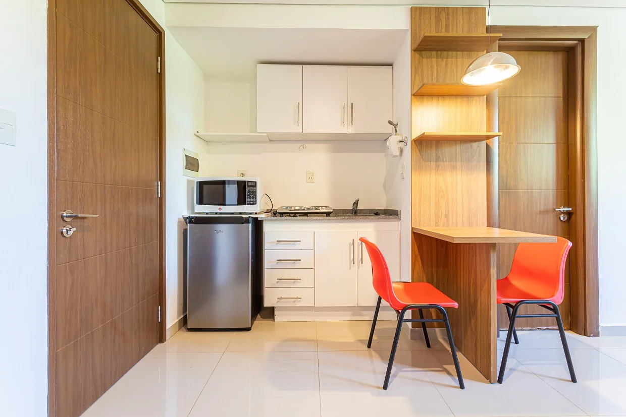 -Unidades equipadas: Cama, escritorio, aire acondicionado, kitchenette, lámpara, mesa con sillas, sofá con puff, televisor, placard de 3 puertas, termo-calefón, cocina eléctrica, microondas y heladera.