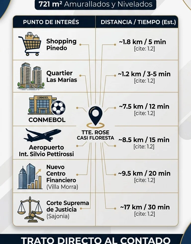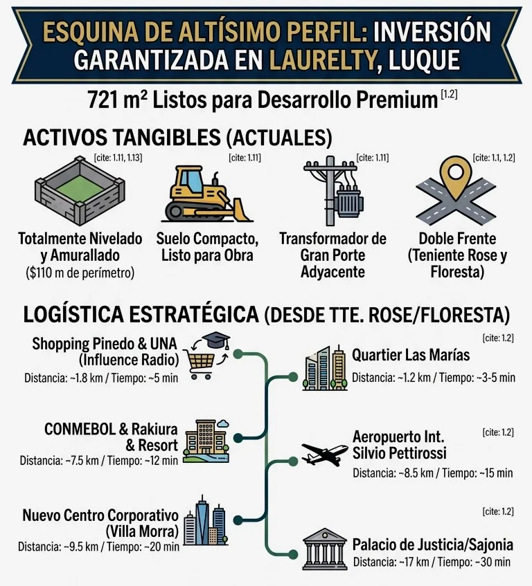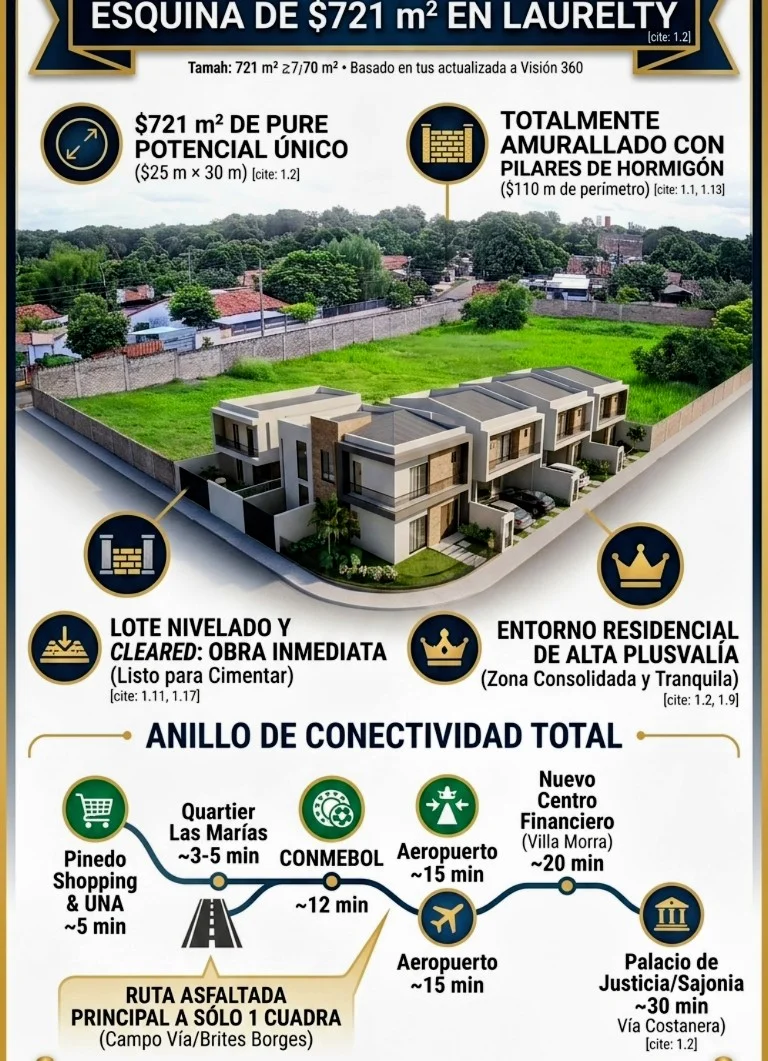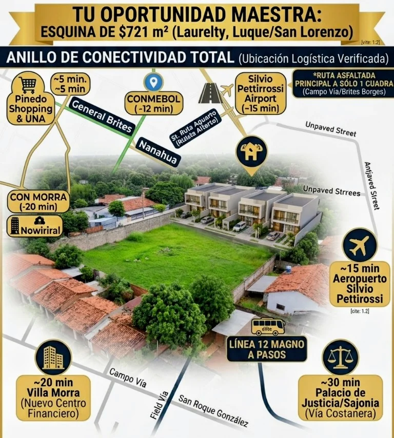 Vendo terreno en esquina premium de 721 m2 ubicado en una esquina privilegiada en Laurelty, Luque, en el límite estratégico con San Lorenzo (a una cuadra de la calle San Roque Gonzáles de Santacruz, cerca del Pinedo Shopping / Quartier Las Marías).
