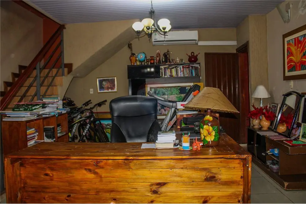 Amplia sala, integrada con escritorio, con una chimenea y aire acondicionado.