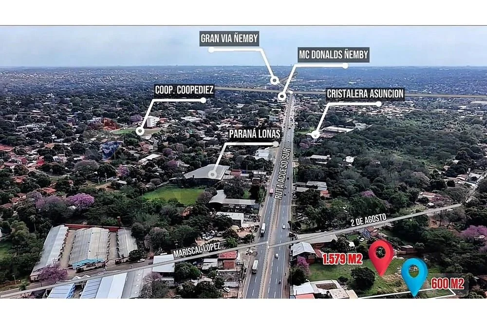 Terreno de 1.579 m² con 15 m de frente directo sobre Acceso Sur en Ñemby, zona de alto tráfico. Incluye dos locales comerciales en frente (exposición inmediata) y casa en el interior. Ubicación privilegiada cerca de Concret Mix, ideal para comercio, sucursal, depósito o estación de servicio. Gran oportunidad de inversión por 1.700 millones de guaraníes!