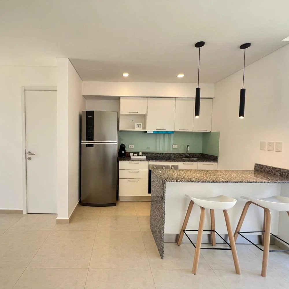 Cocina amoblada con mesada de granito, barra desayunador, horno, anafe, extractor y termocalefón incluidos