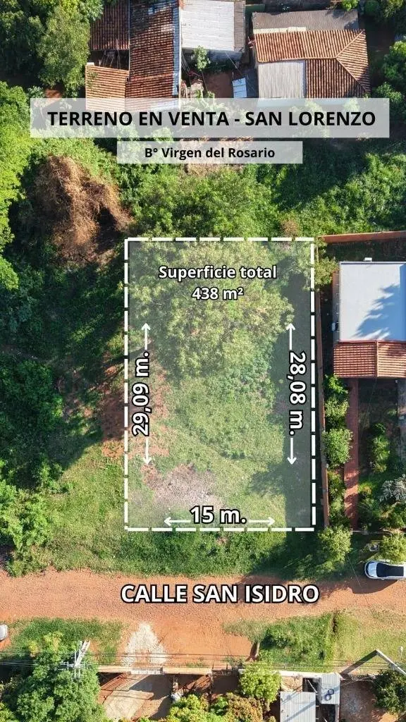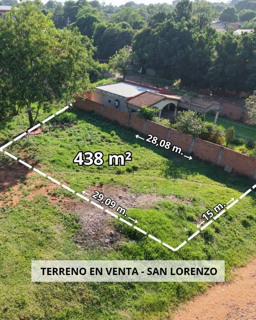 Vendo terreno en San Lorenzo Vendo terreno en San Lorenzo Ubicado en barrio Virgen del Rosario sobre empedrado. A 1 cuadra de la avenida Buenaventura Ocampos. Medidas 15x29 438m2 Precio Gs ***Apto para crédito bancario. Id: 46513