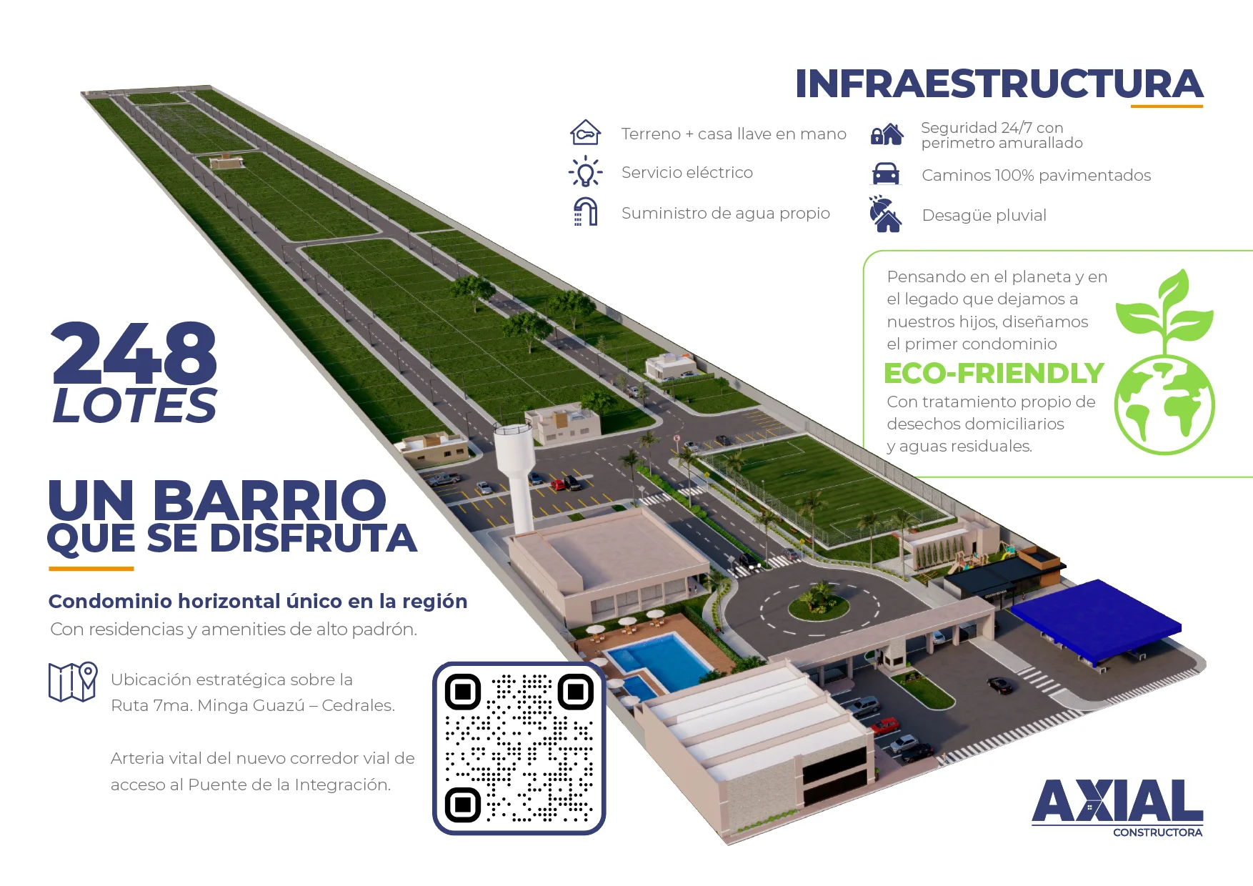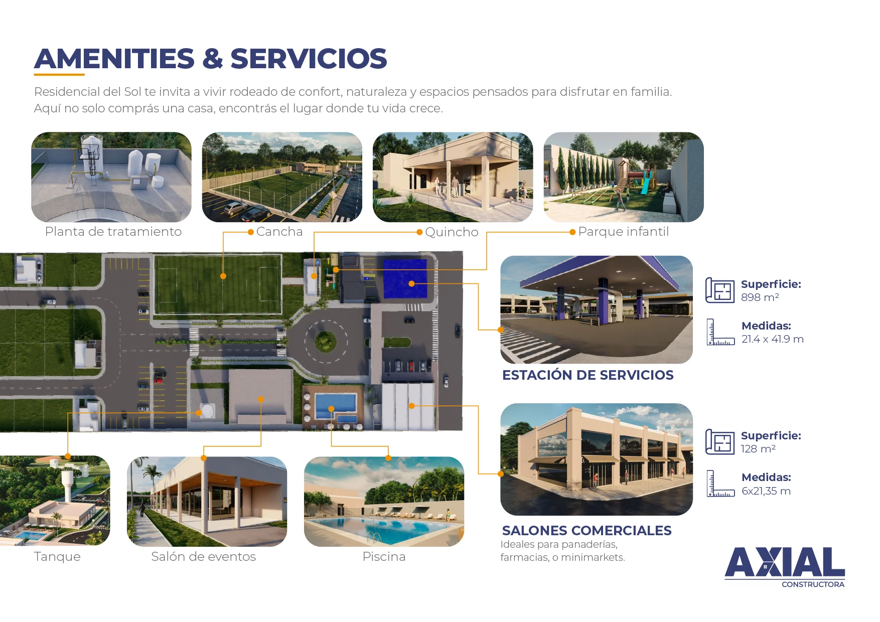 En Residencial del Sol vas a disfrutar de un barrio cerrado con amenities premium: piscina, cancha de fútbol, parque infantil, quincho, salón multiusos y espacios verdes diseñados para la convivencia.