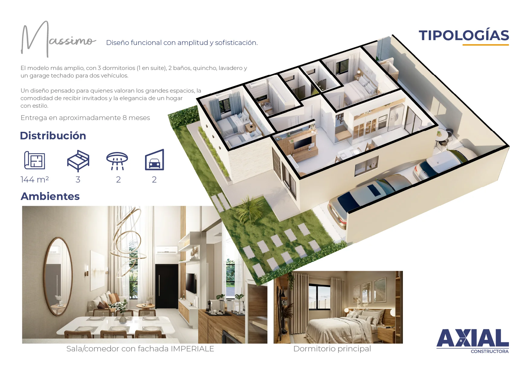 La tipología Massimo (144 m²) es la elección perfecta para quienes desean máxima amplitud, confort y exclusividad dentro de un entorno seguro y moderno. Con un diseño sofisticado y altamente funcional, es ideal para familias que buscan un hogar con espacios generosos y detalles de calidad.