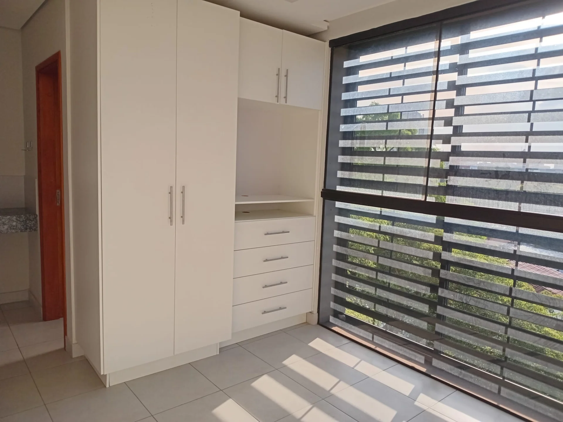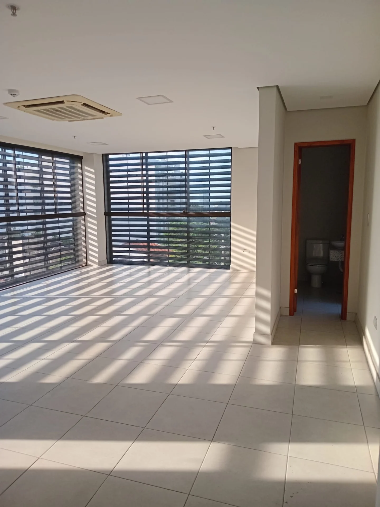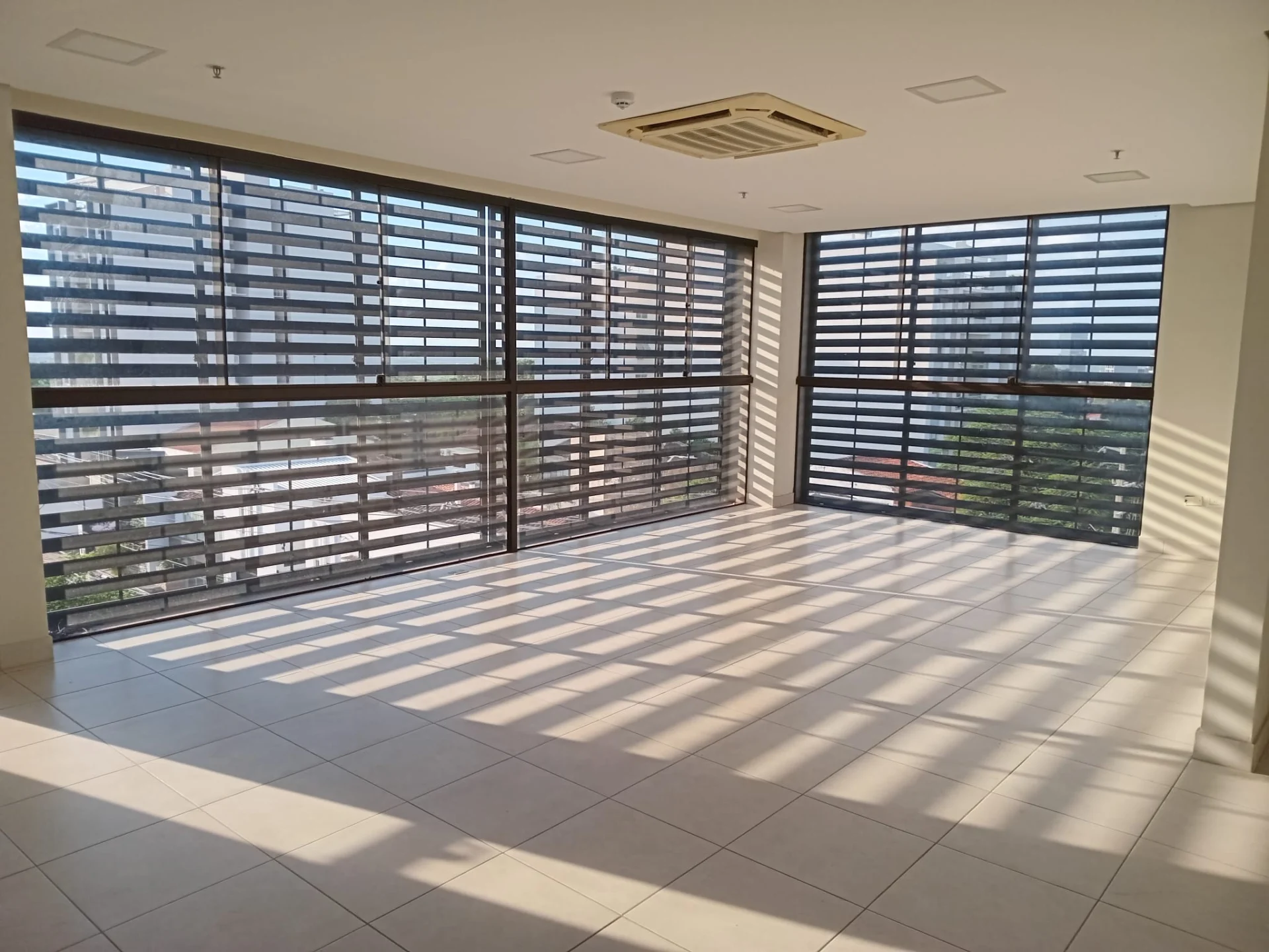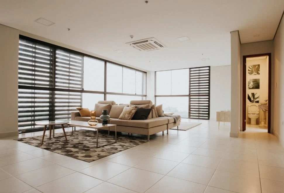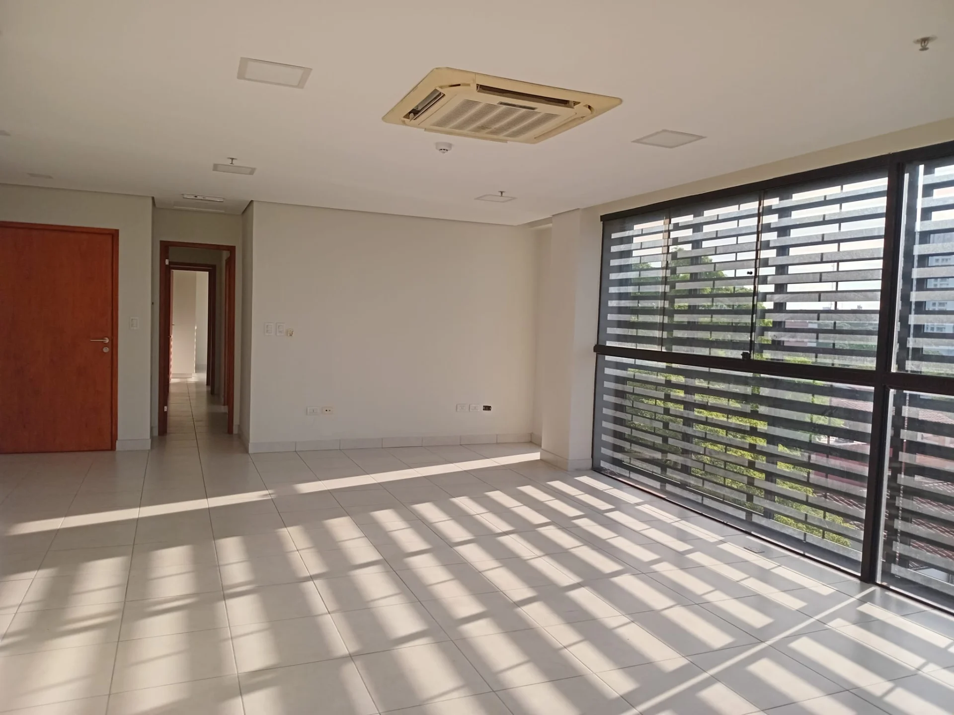 Amplia sala con grandes ventanales, persianas corredizas