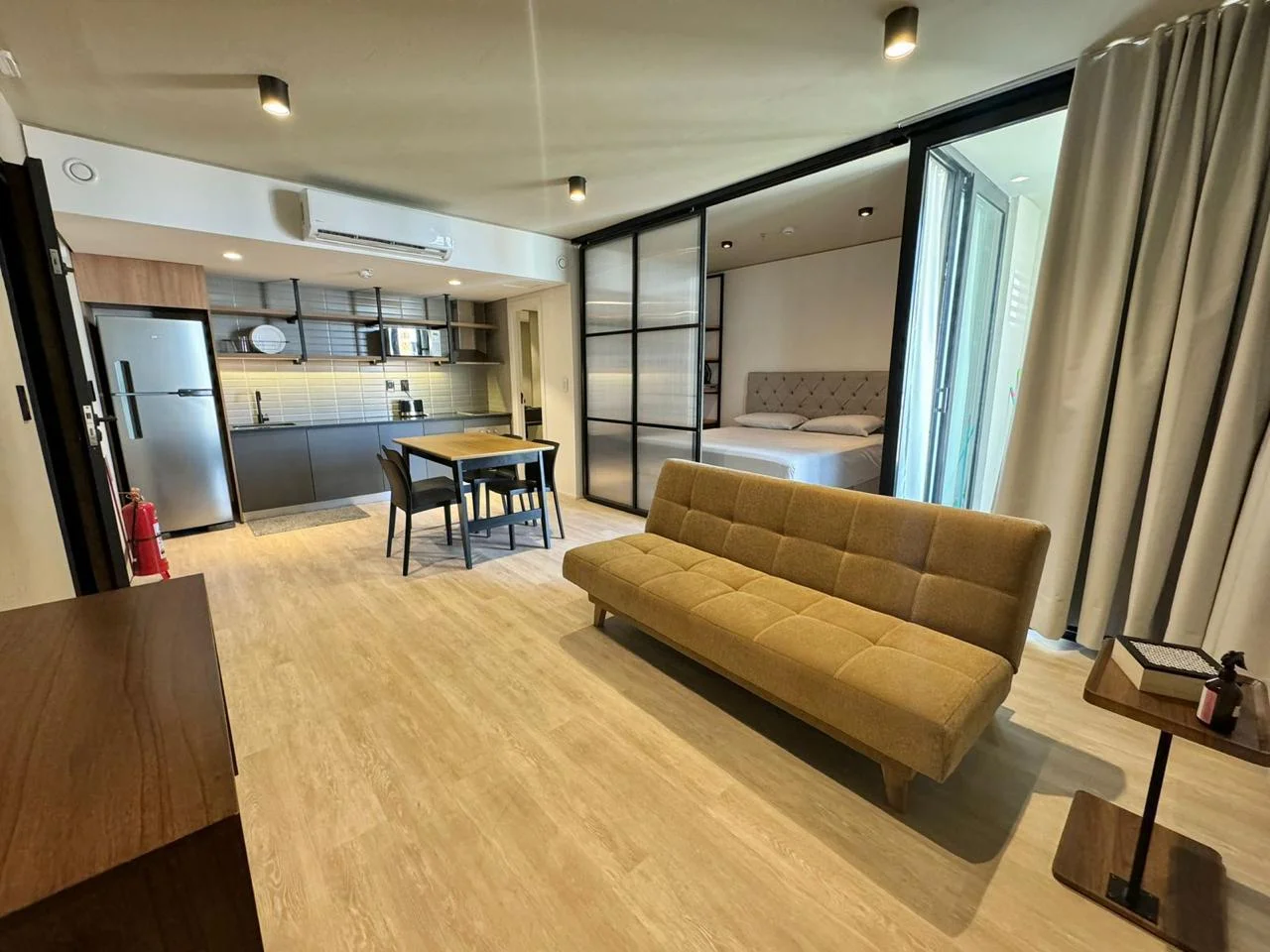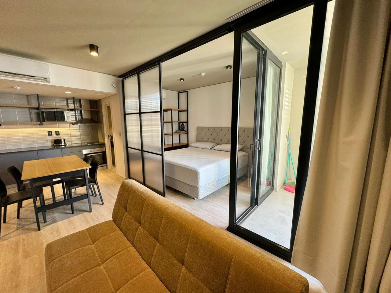- El área de dormitorio semi integrado, con posibilidad de cerrar con una puerta corrediza.
